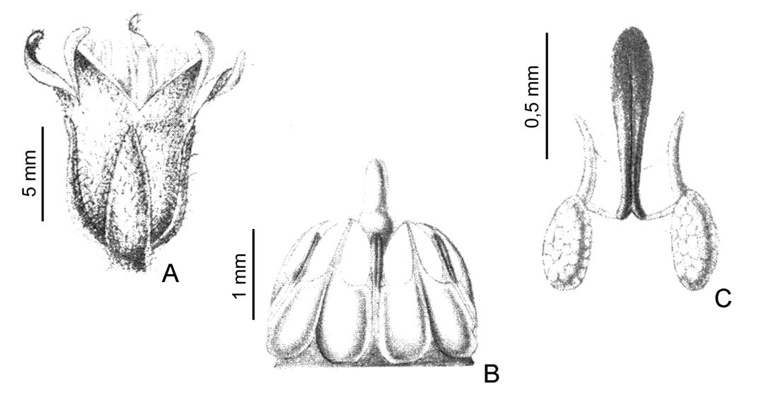 A. Flor. B. Ginostegio. C. Polinario. Tomado de Gen. Sp. Pl. Argent. 2: lámina 36B. 1944.