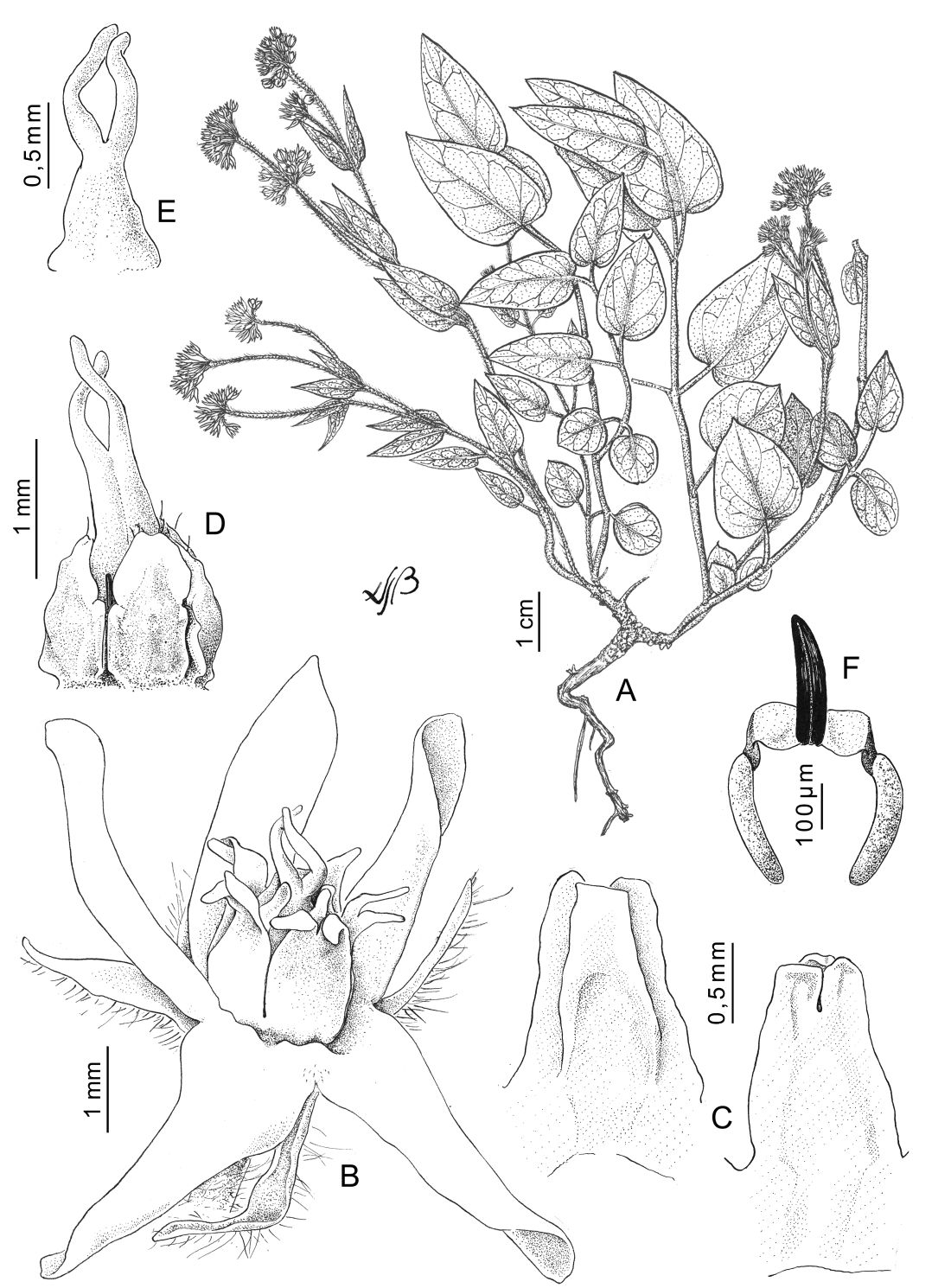 Hierba de 20-25 cm de alto, erecta, tallo usualmente ramificado en la base, pubescente a viloso. Hojas con pecíolo de 3-9 mm de largo, viloso; lámina anchamente ovada a ovada, de 1,5-3,5 × 0,7-2,7 cm, ápice acuminado a agudo, a veces obtuso en hojas basales, base cordada, borde ondulado, pubescente en ambas caras. Inflorescencias umbeliformes, extraaxilares y terminales, multifloras, pedúnculo de 3-10 cm de largo, pubescente a viloso. Flores con pedicelo de 1-2 mm de largo, pubescente; cáliz verde a atropurpúreo, con tubo campanulado breve, lóbulos lanceolados, de 2-3 × 0,7-1 mm, cara abaxial pubescente, cara adaxial glabra; corola con tubo campanulado breve, amarilla o atropurpúrea, lóbulos lanceolados, de 3 × 1 mm, patentes, revolutos, retorcidos, cara abaxial pubescente, cara adaxial glabra, con escasos pelos en la garganta; corona con lóbulos anchos apenas unidos en la base, 2-fidos en el tercio distal, con lígula interna, blanca o atropurpúrea, glabra; ginostegio subsésil de 1 mm de largo, con apéndice de la cabeza estilar del mismo largo, rosado o atropurpúreo, 2-fido en el tercio distal o sólo cortamente 2-lobado en el ápice; anteras subcuadrangulares, de 0,4-0,5 × 0,2-0,3 mm, membrana apical ovada; polinario con el retináculo oblongo, de 0,28-0,30 × 0,06-0,07 mm, con ápice ensanchado, caudículas de 0,15 × 0,18 mm, horizontales, edentadas, con espesamiento oscuro a lo largo del borde externo, polinios reniformes, de 0,32-0,34 × 0,07-0,09 mm. Frutos y semillas no vistos.
