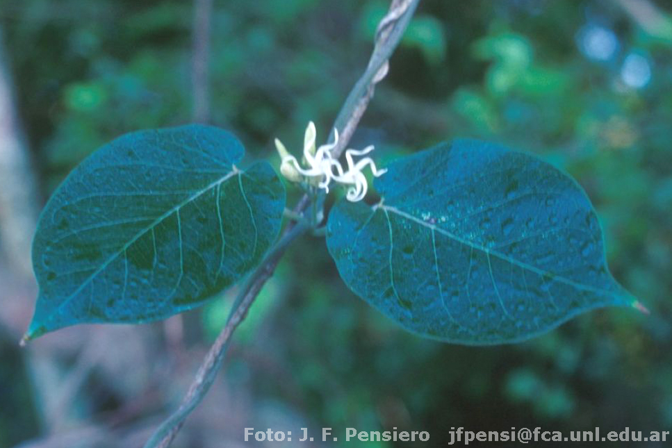 Voluble, hasta de 12 m de alto, ramas tomentosas. Hojas con pecíolo de 1,3-3 cm de largo, pubescente; lámina ovada, elíptica a obovada, de 3-11 × 1,5-8 cm, ápice acuminado, base cordada, cara abaxial tomentosa, cara adaxial pubescente con 3-6 coléteres en la base de la vena media. Inflorescencias corimbiformes, multifloras, pedúnculo de (0,8-)1,3-3 cm de largo, tomentoso. Flores con pedicelo de 1-10 cm de largo, tomentoso; cáliz con lóbulos linear-lanceolados, de 4,5-7 × 0,3-0,9 mm, externamente pubescentes, cara interna glabra con coléteres en el seno; corola con el tubo cilíndrico de 6 mm de largo, blanca, cara externa pubescente, cara interna barbada; lóbulos linear-lanceolados, de 10-16 × 1 mm, reflexos, retorcidos, revolutos, cara externa pubescente, cara interna pubescente con la base barbada; corona con lóbulos ovados de 2,4-3 × 1,3-1,7 mm, ápice redondeado o truncado, con un espesamiento en la porción media de la cara interna, blancos; ginostegio sésil de 2,3-3 × 1,6 mm, con apéndice de la cabeza estilar de 1-1,7 cm de largo, blanco, a veces con la base violácea, 2-fido desde la porción media o más abajo, ramas filiformes flexuosas; anteras rectangulares, de 0,9-2 mm de largo, membrana apical ovada; polinarios con el retináculo oblongo, de 0,65-0,8 × 0,14-0,2 mm, caudículas de 0,26-0,35 mm de largo, descendentes, edentadas, polinios de contorno oblongo, de 0,54-0,65 × 0,16-0,22 mm. Folículos ovoides, de 8,5-10 × 2,5-3 cm, generalmente simples, ápice agudo a mucronado, recto o curvo, surcados longitudinalmente, pubescentes, placenta con alas longitudinales lobuladas. Semillas 180-190 por fruto, obovadas, marginadas, ápice dentado, verrucosas, pardas.