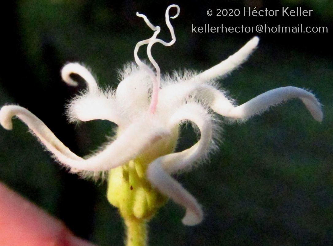 Voluble, hasta de 12 m de alto, ramas tomentosas. Hojas con pecíolo de 1,3-3 cm de largo, pubescente; lámina ovada, elíptica a obovada, de 3-11 × 1,5-8 cm, ápice acuminado, base cordada, cara abaxial tomentosa, cara adaxial pubescente con 3-6 coléteres en la base de la vena media. Inflorescencias corimbiformes, multifloras, pedúnculo de (0,8-)1,3-3 cm de largo, tomentoso. Flores con pedicelo de 1-10 cm de largo, tomentoso; cáliz con lóbulos linear-lanceolados, de 4,5-7 × 0,3-0,9 mm, externamente pubescentes, cara interna glabra con coléteres en el seno; corola con el tubo cilíndrico de 6 mm de largo, blanca, cara externa pubescente, cara interna barbada; lóbulos linear-lanceolados, de 10-16 × 1 mm, reflexos, retorcidos, revolutos, cara externa pubescente, cara interna pubescente con la base barbada; corona con lóbulos ovados de 2,4-3 × 1,3-1,7 mm, ápice redondeado o truncado, con un espesamiento en la porción media de la cara interna, blancos; ginostegio sésil de 2,3-3 × 1,6 mm, con apéndice de la cabeza estilar de 1-1,7 cm de largo, blanco, a veces con la base violácea, 2-fido desde la porción media o más abajo, ramas filiformes flexuosas; anteras rectangulares, de 0,9-2 mm de largo, membrana apical ovada; polinarios con el retináculo oblongo, de 0,65-0,8 × 0,14-0,2 mm, caudículas de 0,26-0,35 mm de largo, descendentes, edentadas, polinios de contorno oblongo, de 0,54-0,65 × 0,16-0,22 mm. Folículos ovoides, de 8,5-10 × 2,5-3 cm, generalmente simples, ápice agudo a mucronado, recto o curvo, surcados longitudinalmente, pubescentes, placenta con alas longitudinales lobuladas. Semillas 180-190 por fruto, obovadas, marginadas, ápice dentado, verrucosas, pardas.