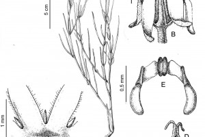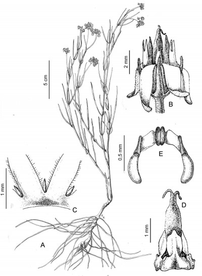 Hierba, de 20-30 cm de alto, erecta, tallo poco ramificado, glabrescente. Hojas con pecíolo brevísimo; lámina linear, de 5 × 1 mm, erguida. Inflorescencias umbeliformes, extraaxilares, multifloras, pedúnculo de 3 cm de largo, pubérulo. Flores con pedicelo de 1-2 mm de largo, pubérulo; cáliz partido casi hasta la base, con 5 coléteres en el seno interno, lóbulos lanceolados, de 3 × 0,6 mm, cara abaxial pubescente, cara adaxial glabra; corola con tubo campanulado de 1 mm de largo, verde-amarillenta o verde crema, lóbulos lanceolados, de 3 × 1 mm, reflexos, glabros en ambas caras; corona con lóbulos blancos, libres entre sí, de 2,2 mm de largo, insertos en la base de la corola, 2-fidos en el tercio apical; ginostegio subsésil, con apéndice de la cabeza estilar liláceo, cilíndrico, obtuso y con 2 protuberancias cónicas en el ápice; anteras con membrana apical ovado-lanceolada, de 1 × 0,7 mm; polinarios con el retináculo elíptico a obovado-elíptico, de 0,2 × 0,09 mm, caudículas de 0,24 × 0,2 mm, subhorizontales, con espesamientos laterales en forma de diente incluso, polinios alargado-reniformes, de 0,38 × 0,12 mm. Frutos y semillas no vistos.
