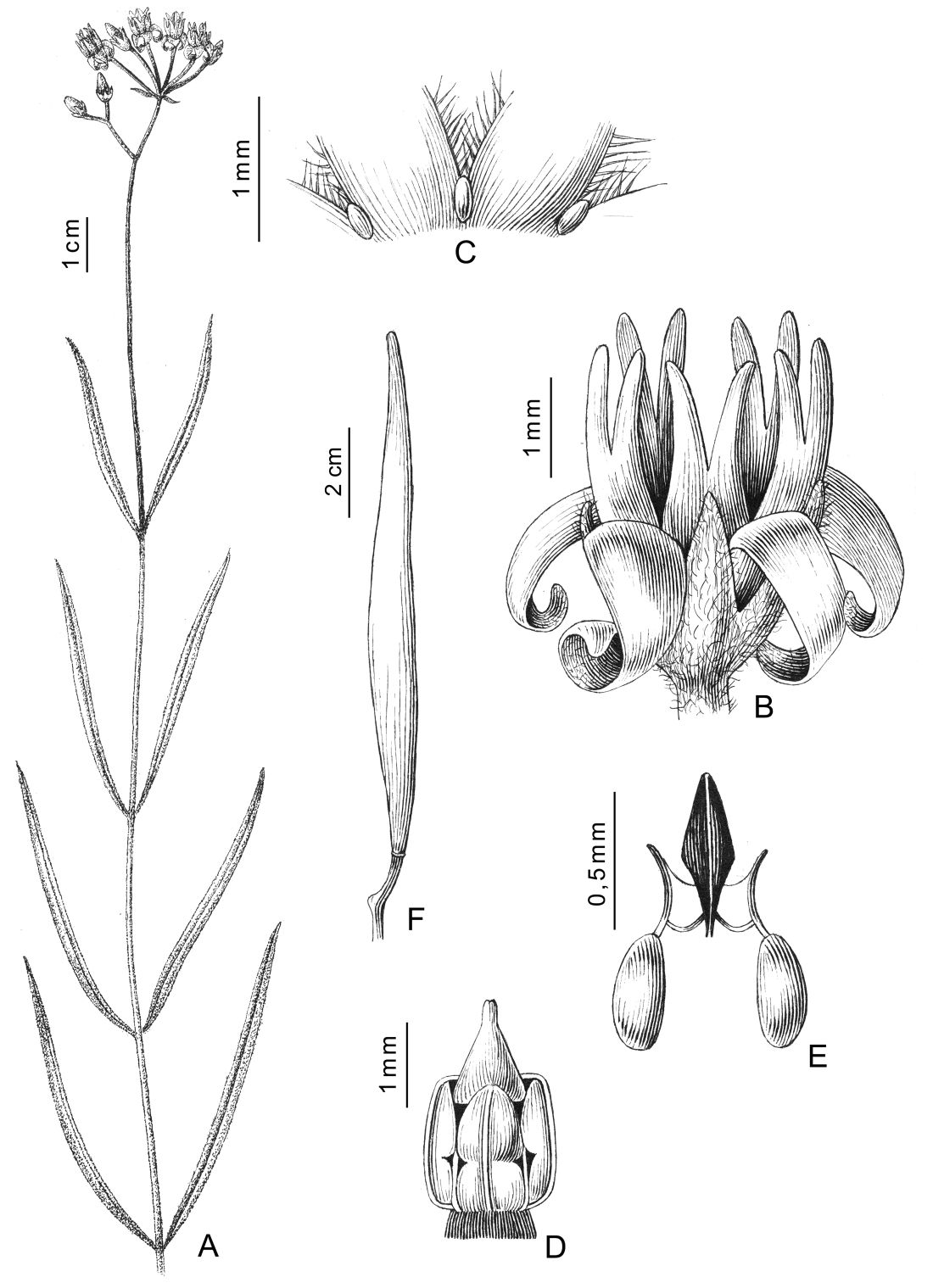 Hierba de 0,8-1 m de alto erecta, tallo simple o poco ramificado. Hojas con pecíolo de 1-3 mm de largo; lámina linear-lanceolada, de 5-8 × 3-7 cm, erguida, con pelos esparcidos en la cara adaxial y sobre las venas de la cara abaxial. Inflorescencias umbeliformes, extraaxilares y terminales, con 4-11 flores, pedúnculo de 1-2 cm de largo, pubescente. Flores con pedicelo de 0,8-1,5 cm de largo, pubescente; cáliz partido casi hasta la base, con coléteres en el seno interno, lóbulos lanceolados, de 2,5 × 1 mm, cara abaxial pubescente, cara adaxial glabra; corola con tubo campanulado de 2 mm de largo, lóbulos linear-lanceolado, de 7 × 2 mm, retorcidos, cara abaxial pubescente, cara adaxial glabra; corona con lóbulos lanceolados, de 3 × 1 mm, partidos hasta casi la mitad y con los segmentos divergentes en el ápice, glabra; ginostegio brevemente estipitado de 1,8 mm de largo, con apéndice de la cabeza estilar cónico, de 1,5 mm de largo; anteras cuadrangulares, membrana apical ovada; polinarios con el retináculo ovado, de 0,7 × 0,3 mm, caudículas horizontales, dentadas, traslúcidas, con espesamiento oscuro a los lados y en la base, polinios oblongo-reniformes, de 0,6 × 0,1 mm. Folículos angostamente fusiformes, de 15 cm de largo, levemente pubescente. Semillas no vistas.