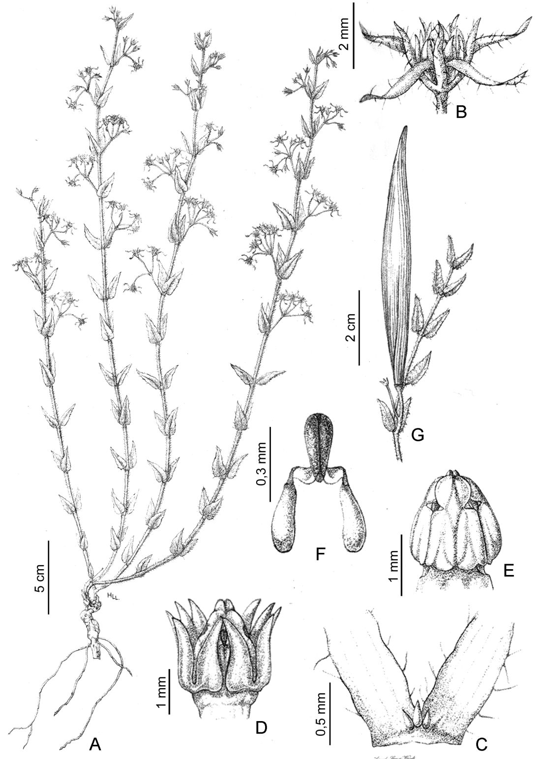 A. Planta. B. Flor. C. Coléteres en el cáliz. D. Corona. E. Ginostegio. F. Polinario. G. Fruto. Tomado de Gen. Sp. Pl. Argent. 2: lámina 33. 1944.
