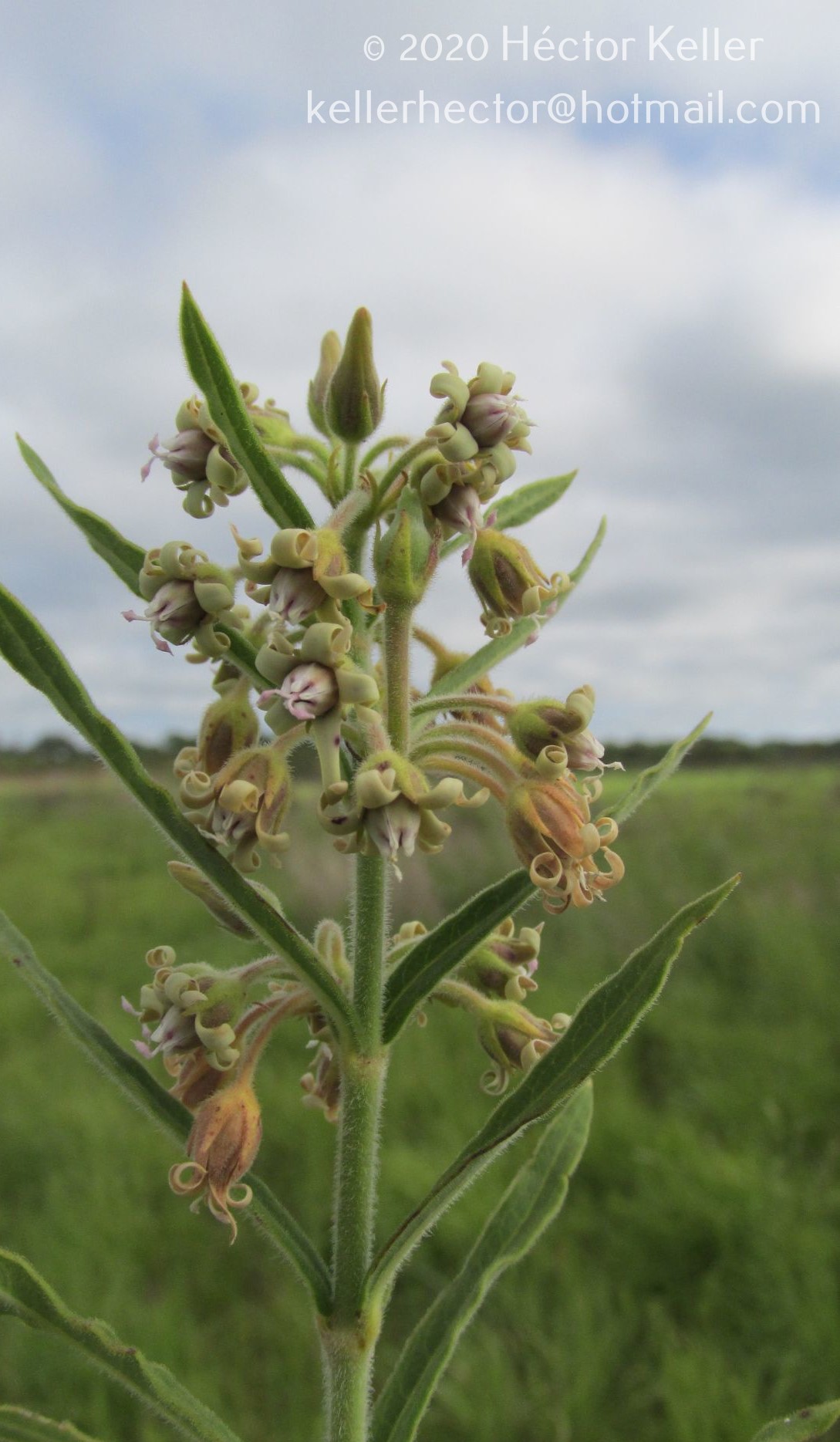 Hierba de 0,7-1,2 m de alto, erecta, tallo simple o poco ramificado, pubescente. Hojas con pecíolo de 1-4 mm de largo, pubescente; lámina linear-lanceolada a linear, de 1,6-7,5 × 0,4-1,5 cm, erguida, ápice brevemente acuminado, base redondeada a subcordada, pubescente en ambas caras. Inflorescencias corimbiformes, extraaxilares, multifloras, pedúnculo de 4 cm de largo, pubescente. Flores con pedicelo de 5-8 mm de largo, pubescente; cáliz partido casi hasta la base, lóbulos linear-lanceolados, de 5 × 1 mm, cara abaxial hirsuta, cara adaxial subglabra; corola con tubo campanulado de 4-5 mm de largo, blanco-verdosa, lóbulos oblongo-lanceolados, de 8 × 2 mm, reflexo-enrollados, cara abaxial pubescente, cara adaxial glabra; corona con lóbulos verdosos o liláceos, de 3 × 1,5 mm, con el ápice partido y un apéndice interno más corto que los segmentos apicales, glabra; ginostegio brevemente estipitado, con apéndice de la cabeza estilar de 5 mm de largo, dividido hacia el ápice en dos segmentos romboidales, anteras cuadrangulares, de 1 mm de largo, membrana apical ovado-lanceolada de igual largo; polinarios con el retináculo lanceolado, de 0,66 × 0,22 mm, caudículas horizontales, con diente lateral curvo, polinios oblongo-ovoides de 0,47 × 0,15 mm. Frutos y semillas no vistos.