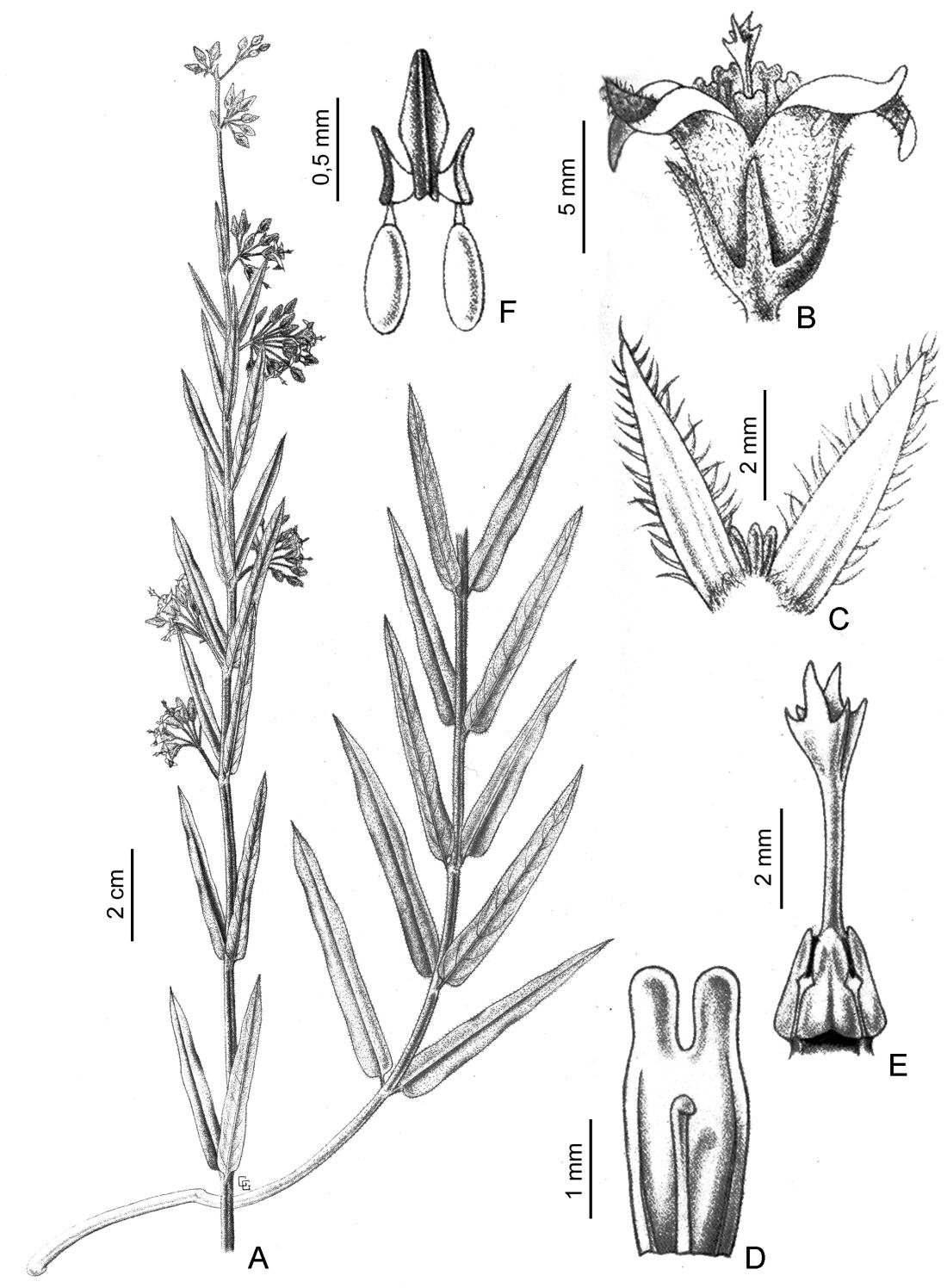 A. Planta. B. Flor. C. Lóbulos del cáliz y coléteres. D. Lóbulo de la corona. E. Ginostegio. F. Polinario. Tomado de Gen. Sp. Pl. Argent. 2: lámina 43. 1944.