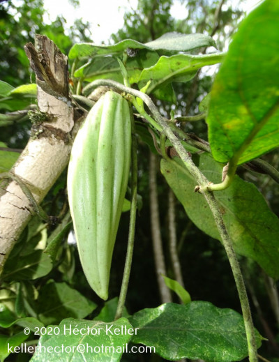 Voluble de 2-8 m de alto, ramas pubescentes a tomentosas. Hojas con pecíolo de 1-3 cm de largo, pubescente a viloso; lámina oblanceolada a oblongo-oblanceolada, de 4-14 × 1,3-6,5 cm, ápice acuminado, base cordulada, pubescente en ambas caras, cara adaxial con coléteres en la base de la vena media. Inflorescencias umbeliformes, extraaxilares, con 2-8 flores, subsésiles. Flores con pedicelo de 2-3 mm de largo, viloso; cáliz con lóbulos linear-lanceolados, de 8-10 × 1 mm, externamente pubescentes, cara interna puberulenta con coléteres en el seno; corola con tubo cilíndrico de 7 mm de largo, amarillo-verdosa, lóbulos lineares, de 12 × 2 mm, erectos, retorcidos, cara externa pubescente, cara interna pubérula en la base; corona con lóbulos subrectangulares, de 4 × 1,8 mm, ápice obtuso, glabra, blanca; ginostegio sésil con apéndice de la cabeza estilar de 1 cm de largo, bulboso y violáceo en la base, el resto filiforme, blanco, 2-furcado en el tercio distal en dos ramas aguzadas, flexuosas; anteras cuadrangulares, de 2 × 1 mm, con membrana apical oblonga, muy pequeña; polinario con el retináculo oblongo-obovado, de 0,50-0,55 × 0,15-0,20 mm, caudículas de 0,3 mm de largo, descendentes, con diente incluso y espesamiento delgado en la base, polinios de contorno oblongo, de 0,40 × 0,10-0,14 mm. Folículos oblongo-ovoides, de 8,5-9 × 2,7-3 cm, generalmente simples, péndulos, surcados longitudinalmente, levemente pubescentes. Semillas 150-170 por folículo, obovadas, de 0,5-0,6 × 0,3-0,4 cm, pardas.