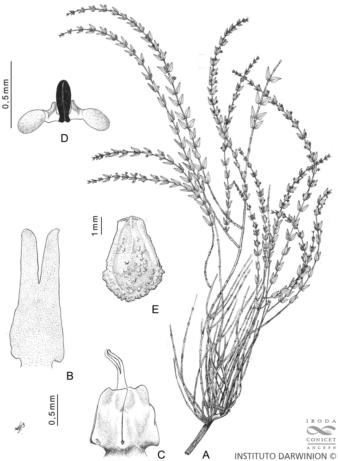 Hierba, con los tallos ramificados, pubescente, con ramas ascendentes de 20-25 cm de largo. Hojas con pecíolo de 1 mm de largo, pubescente; lámina lanceolada a oblongo-elíptica, de 3-5 × 1-2 mm, ápice agudo, base redondeada, pubérula en ambas caras. Inflorescencias umbeliformes, con 1-4 flores, pedúnculo de 0,5 mm de largo, pubescente. Flores con pedicelo de 3-4 mm de largo, pubescente; cáliz partido casi hasta la base, con coléteres en el seno interno, lóbulos linear-lanceolados, de 1,8 × 0,5 mm, cara abaxial pubescente, cara adaxial glabra; corola con tubo muy breve, amarillo-blanquecina a amarillo-lilácea, lóbulos linear-lanceolados, de 3 × 1 mm, patentes, revolutos, retorcidos, glabros en la cara adaxial, pubescentes en la cara abaxial; corona con lóbulos de 2 mm de largo, recurvos, partidos en el tercio distal, segmentos divergentes, glabra, blanca; ginostegio subsésil, con apéndice de la cabeza estilar rematado en dos filamentos de 0,5 mm de largo; anteras cuadrangulares, membrana apical de 0,5 × 0,4 mm; polinario con el retináculo oblongo-obovado, de 0,30-0,35 × 0,10-0,12 mm, caudículas de 0,12-0,13 mm de largo, horizontales, traslúcidas, diente de ápice redondeado, polinios ovoides, de 0,25-0,30 × 0,15 mm. Folículos fusiformes, de 3-7,7 × 0,5-0,8 cm, simples, raramente dobles, con extremo aguzado, erectos, amarillentos con máculas violáceas, pubescentes. Semillas 9-16 por folículo, obovadas, de 4-5 × 2-3 mm, verrucosas, pardas.