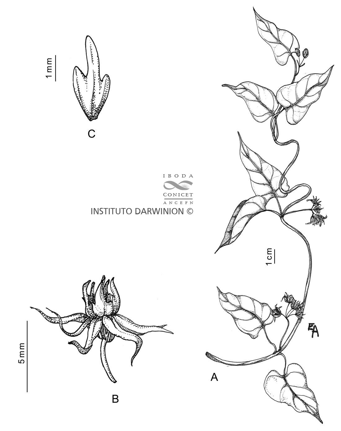 Voluble, rizoma alargado, cilíndrico, de mayor diámetro que ramas; raíces tuberosas ausentes; ramas puberulentas a glabrescentes. Hojas con pecíolo de (1,5-)2,5-2,7 cm de largo; lámina ovada, de 7,5 × 4 cm; base cordada a lobada, ápice agudo, superficie esparsamente pubescente en ambas caras, con 8 coléteres en la base adaxial de la vena media. Inflorescencia corimbiforme, subaxilar, con 8-15 flores; pedúnculo de 2-2,5 cm de largo. Flores con pedicelo de 0,7-1,2 cm de largo; cáliz glabrescente, margen y base de la superficie abaxial pubescentes, coléteres bajo el seno adaxial, lóbulos subovados, de 1,7-5 × 0,8-2 mm; corola subrotácea de 10-17 mm de diámetro, tubo de 1 mm de largo, superficie externa glabra, crema o amarillenta, superficie interna crema, amarillenta o vinácea, garganta puberulenta; lóbulos ovados, 6,4-6,7 × 2,5-3 mm, margen revoluto; corona con lóbulos opuestos a las anteras, levemente unidos en la base, 3-fidos, con dos segmentos laterales anchos y uno central alargado, erecto o incurvo, blancos, rojizos o violáceos; ginostegio sésil o subsésil; membrana apical de las anteras suborbicular; cabeza estilar convexa; retináculo cónico a elipsoide, de 0,3 mm de largo; caudículas subhorizontales, de 0,1 mm de largo, insertas en la parte media del retináculo; polinios largamente oblongos, de 0,45 mm de largo. Folículos obclaviformes, deltoides en sección transversal, de 10 × 2,5 × 1 cm, extremo aguzado, placenta con costillas aserradas. Semillas 250-270, obovadas, de 5-8 × 3-4 mm, castaño-oscuras, rugosas y tuberculadas en ambas caras; con margen ancho, ápice groseramente dentado.