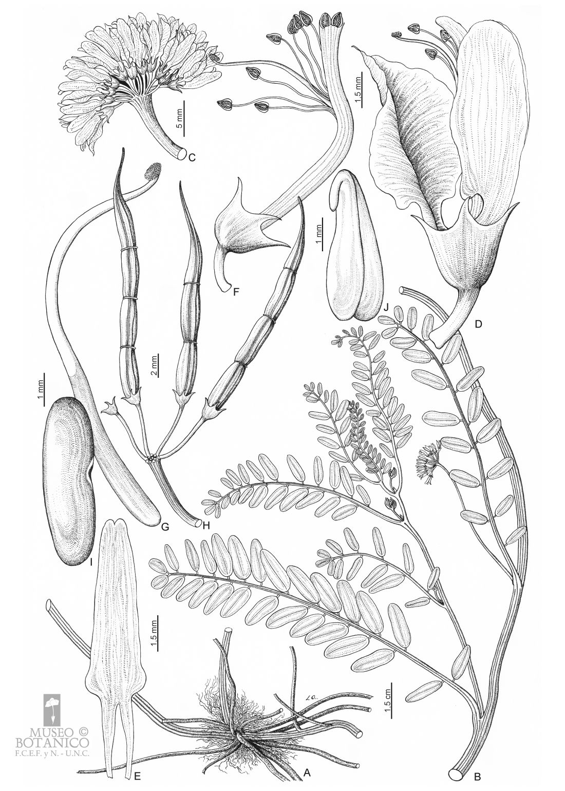 A. Base de la planta con raíces. B. Rama florífera. C. Inflrescencia. D. Flor. E. Quilla. F. Androceo. G. Gineceo. H. Fruto. I. Semilla, vista lateral. J. Embrión.