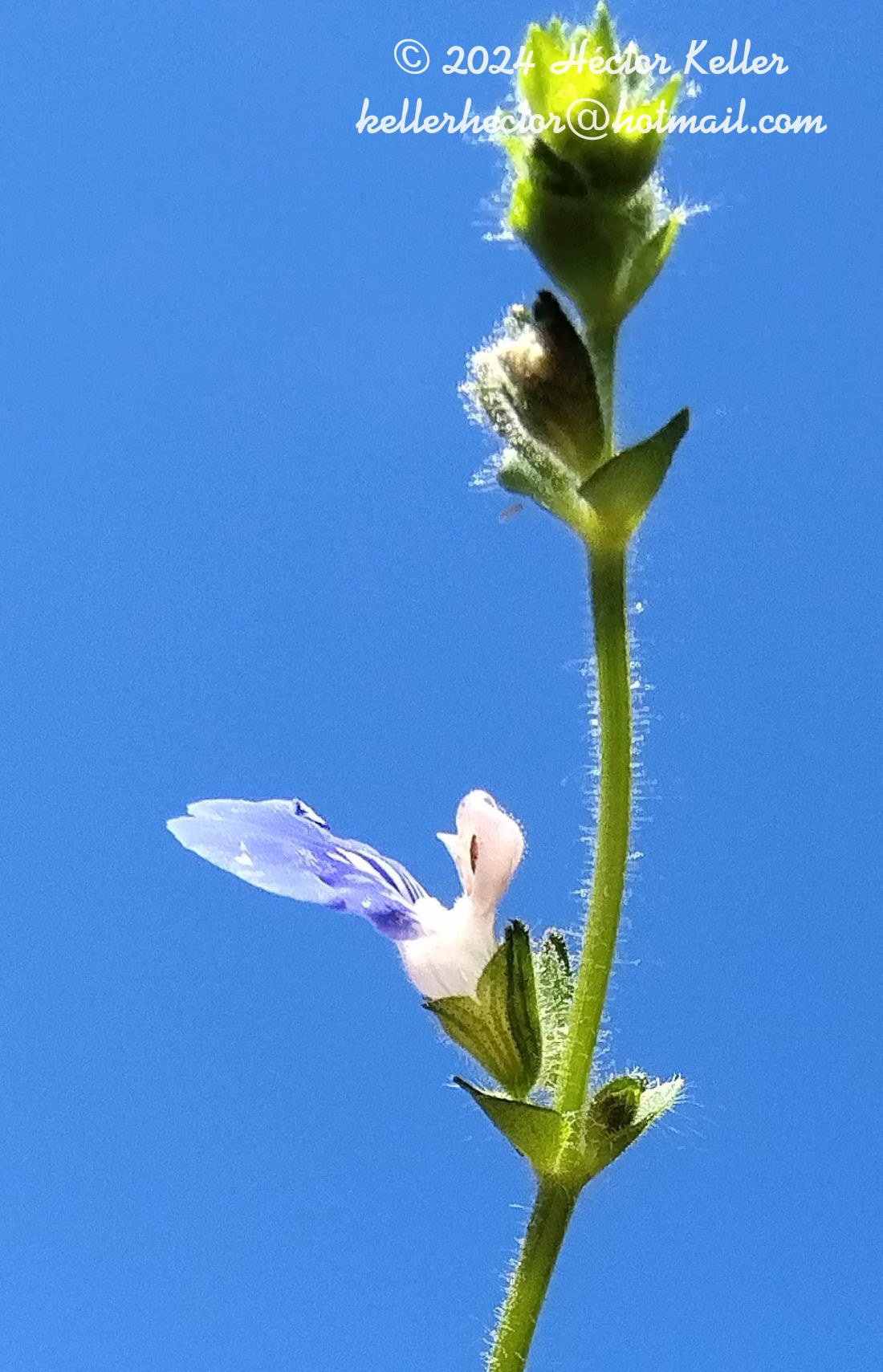 Sufrútices hasta de 65 cm de alto; tallos procumbentes, radicantes, con numerosos pelos glandulares hacia el ápice. Hojas con pecíolos de 0,5-9 cm de largo; láminas ovadas a suborbiculares, de 1-6,5(-8) × 0,7-8 cm, base cordada, ápice redondeado, margen ligeramente crenado, con escasos pelos sobre la nervadura en cara abaxial. Verticilastros de 6-8 flores, reunidos en pseudoracimos terminales laxos, de 7-12 cm de largo. Brácteas florales persistentes en antesis, ovadas, de 2-5 mm de largo, no amplexicaules, pubescentes, de color verde. Flores brevemente pediceladas. Cáliz de 4-8 mm de largo, inconspícuamente nervado, labio superior con ápice entero o ligeramente 3-mucronado, labio inferior con ápice 2- dentado, pubescentes en ambas caras, en la cara interna sólo en la mitad superior. Corola azul o celeste, con mácula estriada blanca, de 12-15 mm de largo, tubo giboso de 7 mm de largo, pubescente en la mitad superior externa, labio superior de 3,5- 4 mm de largo, cóncavo, entero o emarginado, labio inferior de 5-7 mm de largo, 3-lobado, el medio mayor y emarginado. Estambres inclusos. Estilo exerto, ca. 8 mm de largo. Clusas elipsoides, ca. 2,5 mm de largo, trígonas, castañas, finamente granulosas, con surcos oscuros.