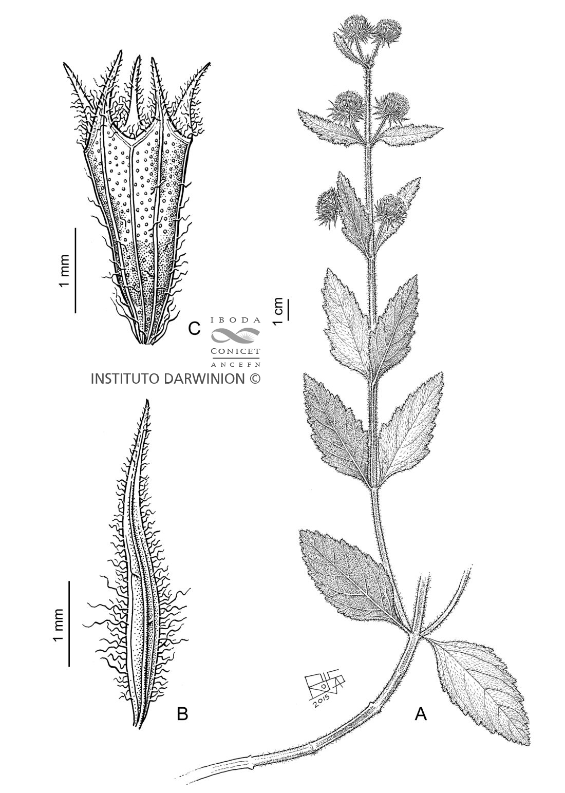 Hierbas perennes, hasta de 1 m de alto; tallos subglabros en la base, pilosos hacia el ápice, con pelos adpresos y antrorsos, largos. Hojas subpecioladas; pecíolos de 2-8 mm de largo; láminas ovadas o elípticas, de 2,5-7 × 2,2-3,5 cm, base cuneada y decurrente, ápice agudo u obtuso, margen desigualmente serrado-dentado o ligeramente pinnatilobado con 3-5 pares de dientes mayores, híspido-estrigosas en ambas caras, con pelos breves, dispuestos densamente, con algunas glándulas sésiles en la cara abaxial. Capítulos globosos, de 1- 2 cm de diámetro, multifloros, solitarios en la axila de las hojas superiores; pedúnculos de 2-4,5 cm de largo, densamente villosos; bractéolas involucrales angostamente elípticas, de 9- 12 × 1-2 mm, patentes al principio, curvadas en la base, tornándose reflejas en la fructificación, glabras en la cara interna, pilosas en la externa, nervadura media prominente, el margen ciliado. Flores sésiles con pelos rectos, de 1-2 mm de largo, naciendo del receptáculo; cáliz de 4,5-6 mm de largo, subglabro externamente o con un anillo de pelos largos o glándulas sésiles dispersas, internamente subglabro, margen ciliado, dientes del cáliz deltoides, de 1,5-2 mm de largo, con ápice subulado; corola de 6-7 mm de largo, blanca con manchas rosado-claras en el labio superior. Clusas oblongo-ovoides, ca. 1,3 mm de largo, castaño-oscuras, lisas, glabras.