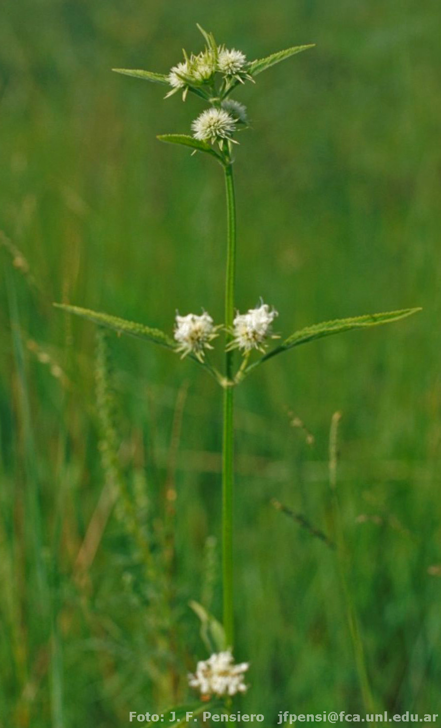 Hierbas perennes hasta de 1,5 m de alto; tallos pilosos, con pelos adpresos. Hojas pecioladas; pecíolos de 0,5-4 cm de largo; láminas elípticas o angostamente ovadas, de 3-15 × 0,5-2(-4) cm, base aguda, atenuada, ápice agudo, margen irregularmente aserrado, híspido-estrigosas en ambas caras, con pelos breves dispuestos densamente, en ocasiones subglabras cuando maduras. Capítulos globosos, de 1-1,8 cm de diámetro, multifloros, solitarios en la axila de las hojas superiores; pedúnculos de 1- 2 cm de largo, con pelos adpresos; bractéolas involucrales angostamente ovadas, de 6-10 mm de largo, acuminadas, estrigosas, de margen ciliado. Flores subsésiles, con pubescencia de pelos muy largos en la base, naciendo del receptáculo; cáliz florífero de 5 mm de largo, acrescente hasta de 8 mm en el fruto, el exterior ligeramente estrigoso, con pelos glandulares sésiles, entremezcladas, interior del cáliz glabro, dientes del cáliz de 2-3,5 mm de largo, largamente aristados, margen ciliado; corola rosada o blanca, de 5-10 mm de largo. Clusas ovoides, de 1-1,5 mm de largo, castaño-oscuras, glabras.