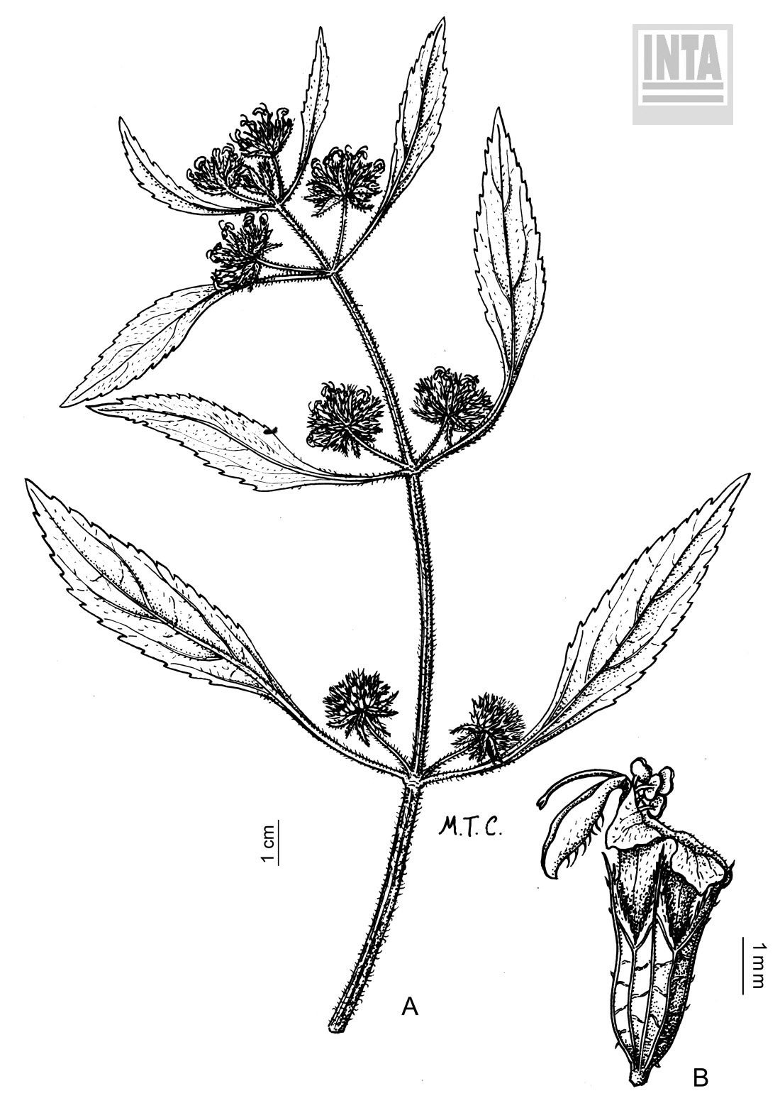 Hierbas perennes hasta de 1,5 m de alto; tallos pilosos, con pelos adpresos. Hojas pecioladas; pecíolos de 0,5-4 cm de largo; láminas elípticas o angostamente ovadas, de 3-15 × 0,5-2(-4) cm, base aguda, atenuada, ápice agudo, margen irregularmente aserrado, híspido-estrigosas en ambas caras, con pelos breves dispuestos densamente, en ocasiones subglabras cuando maduras. Capítulos globosos, de 1-1,8 cm de diámetro, multifloros, solitarios en la axila de las hojas superiores; pedúnculos de 1- 2 cm de largo, con pelos adpresos; bractéolas involucrales angostamente ovadas, de 6-10 mm de largo, acuminadas, estrigosas, de margen ciliado. Flores subsésiles, con pubescencia de pelos muy largos en la base, naciendo del receptáculo; cáliz florífero de 5 mm de largo, acrescente hasta de 8 mm en el fruto, el exterior ligeramente estrigoso, con pelos glandulares sésiles, entremezcladas, interior del cáliz glabro, dientes del cáliz de 2-3,5 mm de largo, largamente aristados, margen ciliado; corola rosada o blanca, de 5-10 mm de largo. Clusas ovoides, de 1-1,5 mm de largo, castaño-oscuras, glabras.