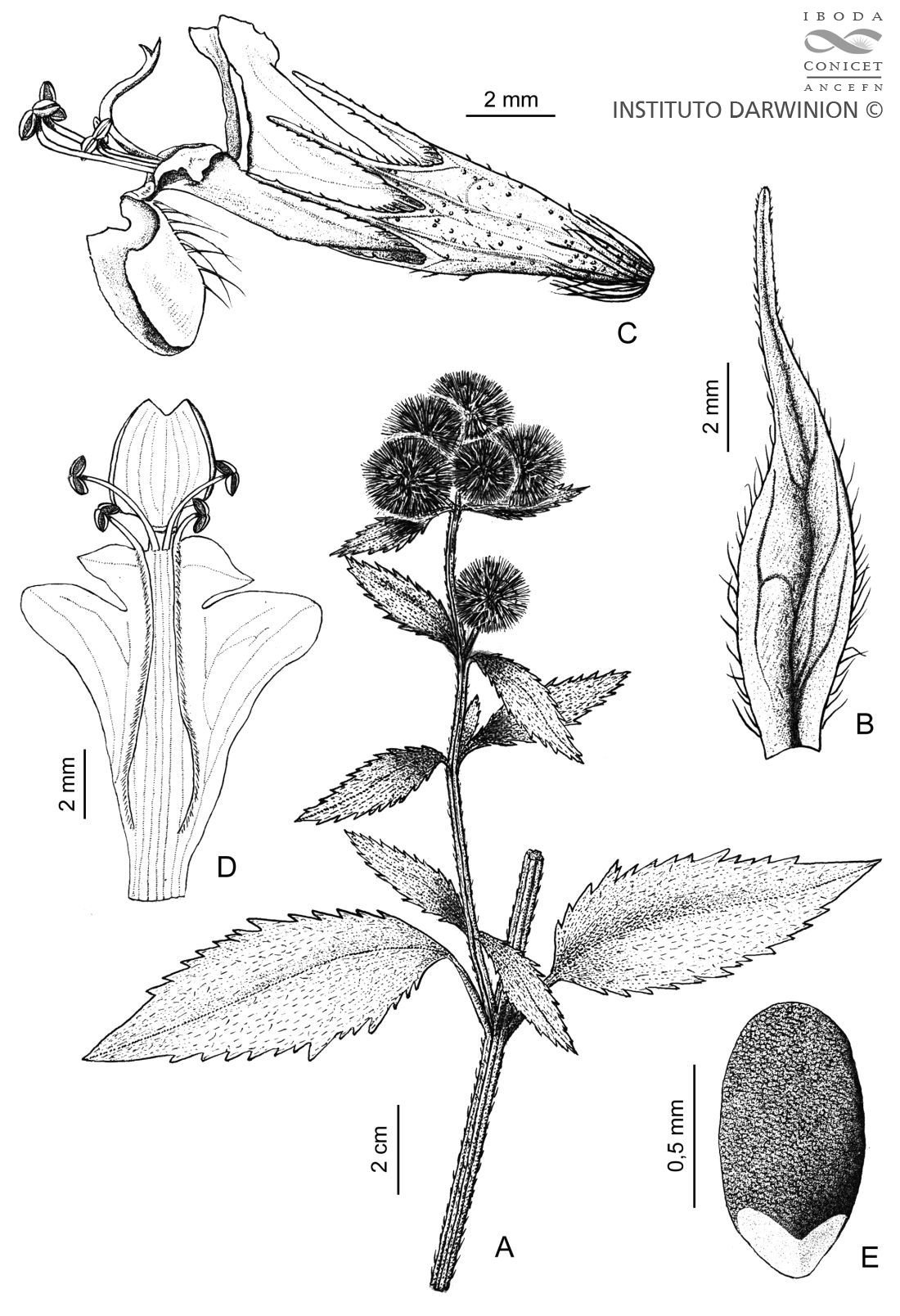 Hierbas perennes hasta de 1,5 m de alto; tallos pilosos, con pelos adpresos. Hojas pecioladas; pecíolos de 0,5-4 cm de largo; láminas elípticas o angostamente ovadas, de 3-15 × 0,5-2(-4) cm, base aguda, atenuada, ápice agudo, margen irregularmente aserrado, híspido-estrigosas en ambas caras, con pelos breves dispuestos densamente, en ocasiones subglabras cuando maduras. Capítulos globosos, de 1-1,8 cm de diámetro, multifloros, solitarios en la axila de las hojas superiores; pedúnculos de 1- 2 cm de largo, con pelos adpresos; bractéolas involucrales angostamente ovadas, de 6-10 mm de largo, acuminadas, estrigosas, de margen ciliado. Flores subsésiles, con pubescencia de pelos muy largos en la base, naciendo del receptáculo; cáliz florífero de 5 mm de largo, acrescente hasta de 8 mm en el fruto, el exterior ligeramente estrigoso, con pelos glandulares sésiles, entremezcladas, interior del cáliz glabro, dientes del cáliz de 2-3,5 mm de largo, largamente aristados, margen ciliado; corola rosada o blanca, de 5-10 mm de largo. Clusas ovoides, de 1-1,5 mm de largo, castaño-oscuras, glabras.
