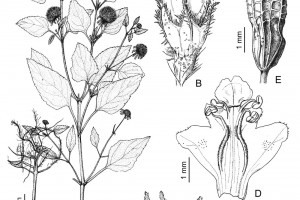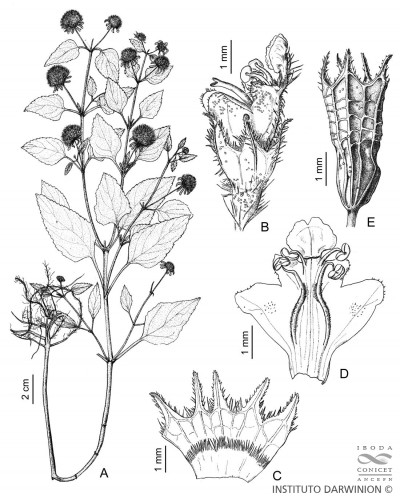 Hierbas perennes hasta de 1 m de alto; tallos subglabros o pilosos, con pelos adpresos. Hojas pecioladas; pecíolos de 0,3-3,5 cm de largo; láminas anchamente ovadas, de 1-7,5 × 0,5-3 cm, base truncada a obtusa, ápice agudo, margen finamente aserrado, subglabras, en ocasiones con algo estrigosas en la cara adaxial o sobre las nervaduras de las cara abaxial, presencia de abundantes glándulas sésiles en cara abaxial. Capítulos globosos, de 1-1,5 cm de diámetro, multifloros, solitarios en la axila de las hojas superiores; pedúnculos de 0,5-4 cm de largo, glabros o pilosos; bractéolas involucrales ovadas, de 8-10 mm de largo, acuminadas, estrigosas, de margen ciliado. Flores subsésiles, con pubescencia de pelos muy largos en la base, naciendo del receptáculo; cáliz florífero de 2,5-3,5 mm de largo, acrescente hasta 5 mm en el fruto, el exterior ligeramente estrigoso, con pelos glandulares sésiles, entremezclados, internamente el cáliz presenta una densa banda de pelos gruesos, breves, dientes del cáliz triangulares, ca. 1 mm de largo, largamente aristados, con margen ciliado; corola de 3,5-6,5 mm de largo, blanca con manchas rosadas. Clusas ovoides, ca. 1 mm, castaño-oscuras, glabras.