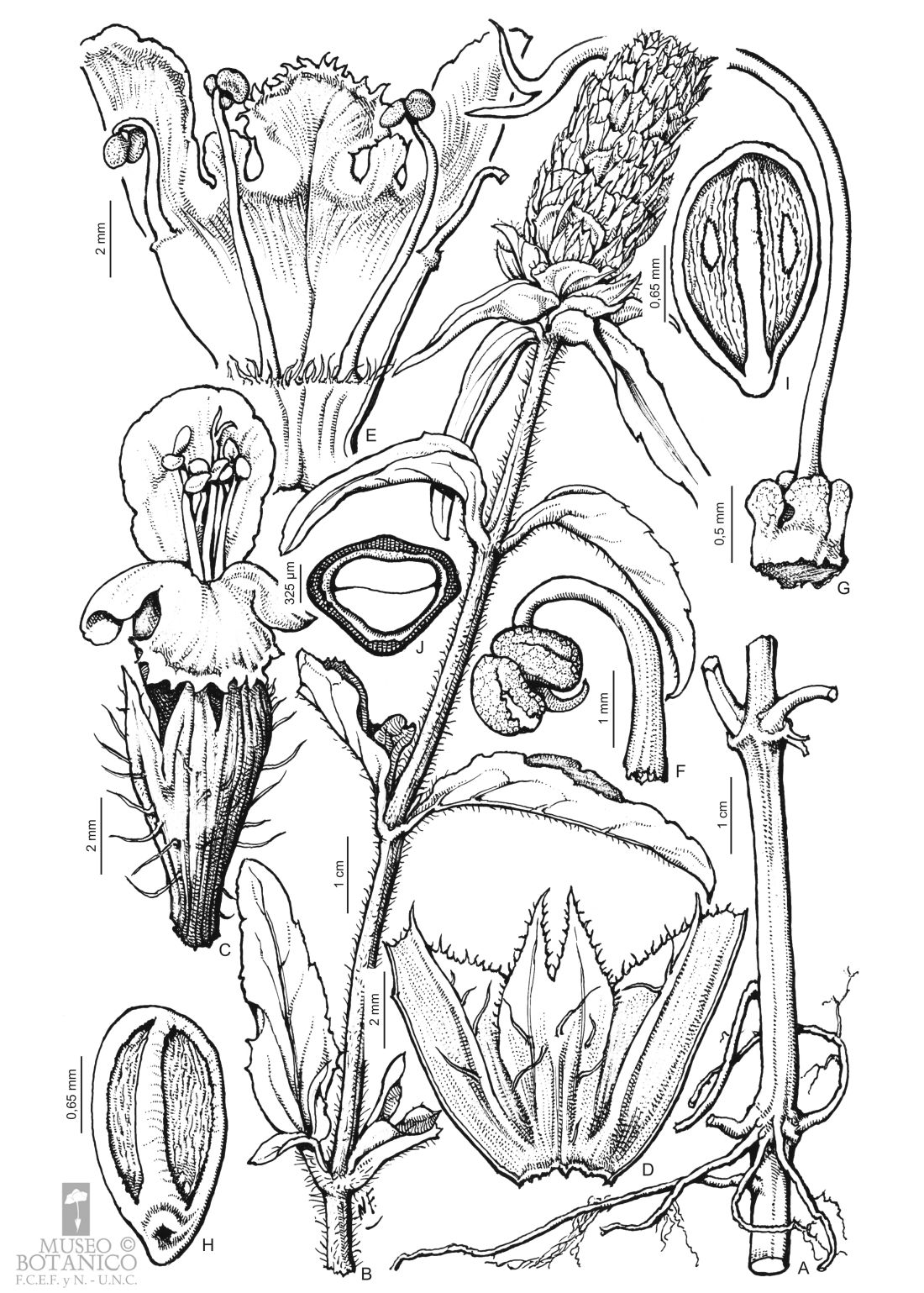 A. Nudo radicante. B. Rama florífera. C. Flor. D. Cáliz. E. Corola desplegada. F. Estambre. G. Gineceo mostrando el estilo ginobásico. H-I. Núculas. J. Transcorte por núcula.