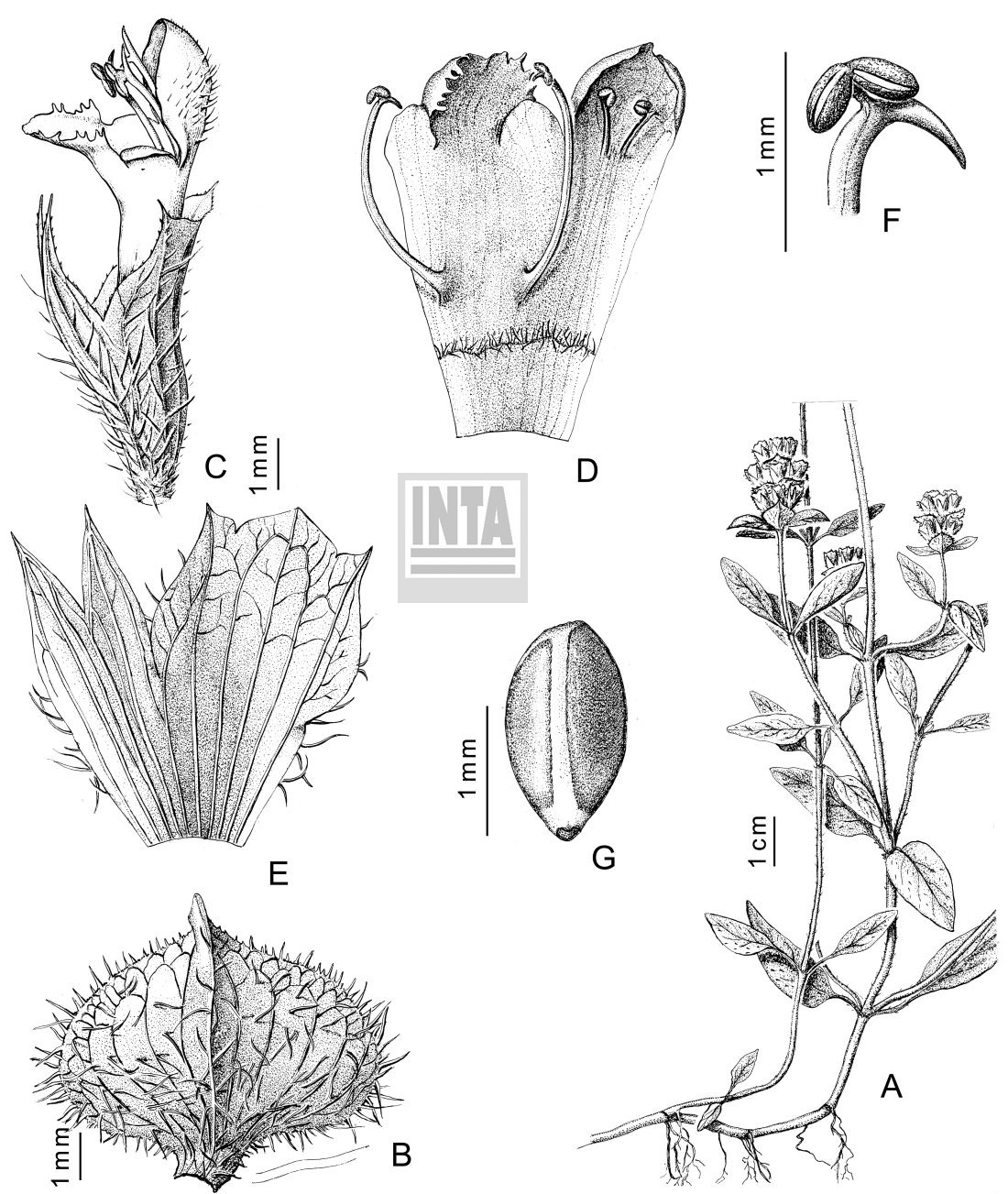 A. Planta. B. Bráctea. C. Flor. D. Corola desplegada. E. Cáliz, cara interior. F. Estambre. G. Clusa.