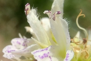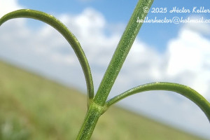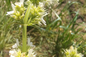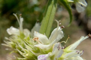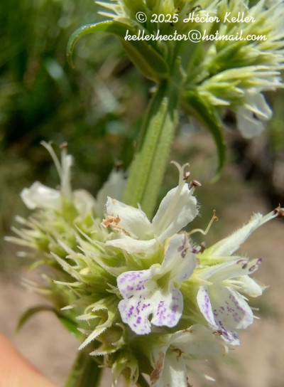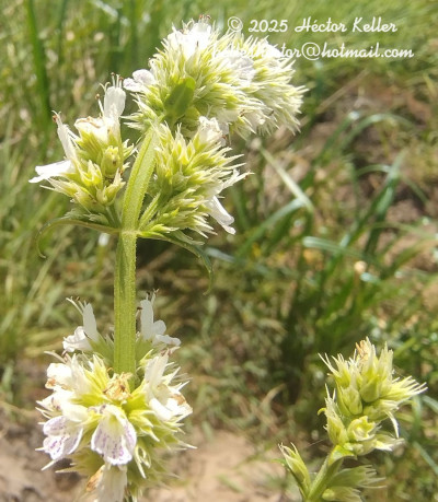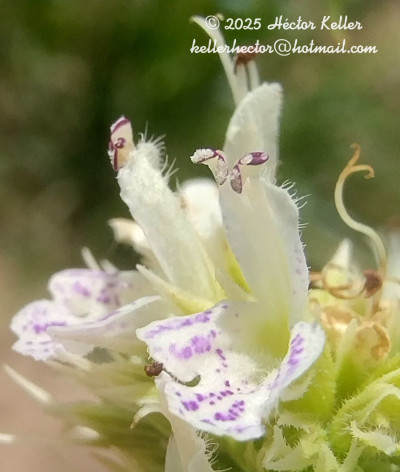 Hierbas perennes, hasta de 1,5 m de alto; tallos con ramificaciones cortas, ascendentes, glabros en la parte inferior, pubérulos a densamente hispídulos hacia la parte superior. Hojas sésiles, angostamente lineares, de 1-6 × 0,1-0,5 cm, base obtusa, ápice agudo, margen engrosado. Cimas axilares, reunidas en verticilastros congestos multifloros de 1-20 cm de largo, los inferiores espaciados; brácteas lineares, de 5-15 × 1-2 mm. Flores subpediceladas, con 2 bractéolas basales, lineares, de 1-2,5 mm de largo; cáliz bilabiado, infundibuliforme, de 4-6 mm de largo, hispidulo a lo largo de los nervios y ciliado en margen de los dientes, éstos marcadamente agudos, lineares, los 3 superiores de 1-2 mm de largo, los 2 inferiores de 2-3 mm de largo; corola blanca, pubescente exteriormente, tubo de 2,5-5 mm de largo, interiormente pubérulo, labio superior de 2-3 mm de largo, el inferior algo mayor; 2 estambres de 2,5-5 mm de largo, algo exertos. Clusas ovoides, de 0,5-1 mm de largo, castaño-oscuras.