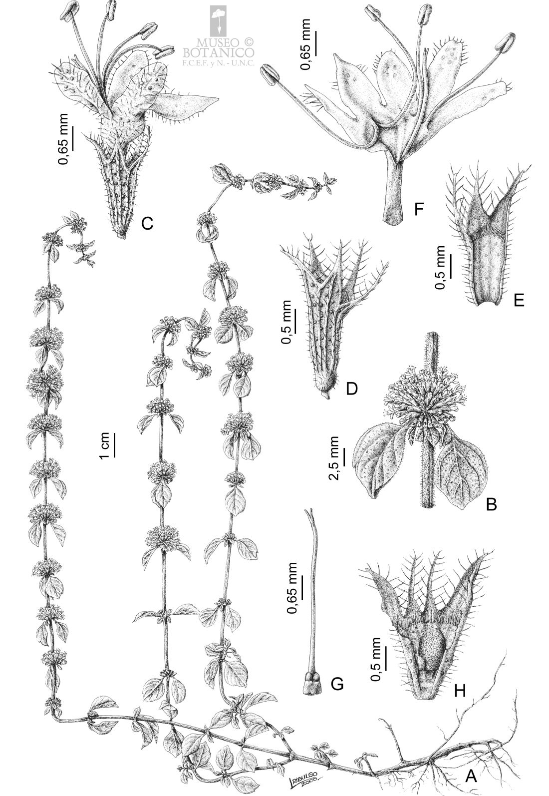 Sufrútices de 15-70 cm de alto, decumbentes; rizomas rastreros; tallos simples o ramificados. Hojas subsésiles; láminas ovadas o elípticas, de 5-15(-30) × 2-5(-15), base y ápice agudos, margen subcrenado, con pelos simples y pelos glandulares peltados. Verticilastros esféricos a hemiesféricos, espaciados, reunidos en pseudoespigas laxas; brácteas foliáceas de 5-8 mm de largo; bractéolas de 2-4 mm de largo, con pubescencia corta. Cáliz subtubuloso, de 2,5-4 mm de largo, 10-nervado, con carpostegio, exteriormente pubescente, 5-dentado, los 3 dientes superiores triangulares, cortos, los 2 inferiores tubulares; corola rosa o lila, de 4,5-6 mm de largo, sub-bilabiada, vellosa en la porción superior del tubo y lóbulos, giboso en la porción exerta, 4-lobado, labio superior recto, entero, labio inferior con lóbulos central más largo y curvado; estambres exertos, filamentos de 3- 4 mm de largo, insertos a la altura de la giba de la corola; estilo de 5-6 mm de largo, exerto, con pelos en la zona media y superior; ramas estigmáticas iguales. Clusas ovoides a subtrígonas, de 0,8 × 0,6 mm, castaño claras, lisas o finamente reticuladas.