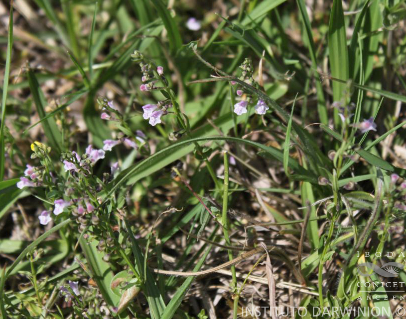 Hierbas perennes, rizomatosas, glabras, de 15-30 cm de alto; tallos decumbentes o erectos, radicantes. Hojas con pecíolo breve, de 1-4 cm de largo; láminas angostamente ovadas, de 1-3(-5) × 0,3- 0,7 cm, ápice agudo y base hastada o redondeada, margen liso, ambas caras glabras. Flores solitarias en la axila de las hojas, reunidas en pseudoracimos foliosos; pedicelos de 2-3 mm de largo; bractéolas pequeñas, a veces ausentes. Brácteas indistinguibles de las hojas. Cáliz de 1,5-2,5 mm de largo, poco acrescentes en fructificación, hirsuto. Corola rosada o morada, pilosa, de 5-8 mm de largo, labio superior entero, el inferior 3-lobado, con lóbulos laterales soldados al superior. Estambres pilosos en la base. Ginóforo sin apéndices. Clusas globosas, amarillentas, tuberculadas.