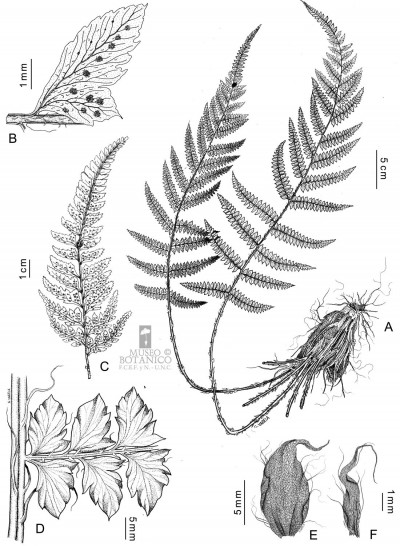 Rizomas ascendentes, breves, con escamas anchamente lanceoladas, de margen ciliado hacia el ápice, concoloras, castañas. Frondes fasciculadas, de 75-150 × 10-30 cm; pecíolos 1/3 la longitud de la fronde, castaño-amarillentos, con escamas de 5-15 × 3-5 mm, las mayores ovado-lanceoladas, generalmente concoloras, castañas a ferrugíneas, algunas oscurecidas en la base y el centro, las menores triangulares, con cilias largas; láminas ca. 2 veces más largas que anchas, elíptico-lanceoladas, 2-pinnadas, de color verde oscuro, terminando en una porción apical elongada, 1-pinnada; raquis con 1 ó 2 yemas gemíferas, escamosas, cercanas al ápice, a veces también presentes en los raquis secundarios, escamas del raquis esparcidas, triangulares a filiformes, de 4-7 × 0,2-1 mm, ciliadas, castaño claras; pinnas ca. 4 veces más largas que anchas, ápice pinnatífido, perpendiculares al raquis con los extremos ascendentes, pinnas basales iguales o algo menores que las medias, en ocasiones mayores, y descendentes; pínnulas ca. 2 veces más largas que anchas, cartáceas, base asimétrica, aurícula diferenciada, espínulas más desarrolladas en el ápice y la aurícula, margen basiscópico entero, margen acroscópico crenado o aserrado, lado abaxial con escamas filiformes, castaño pálidas. Soros circulares, ocupando la mayor parte del envés de la lámina, sin indusio. Esporas de 30- 35 µm de largo, con perisporio fenestrado.