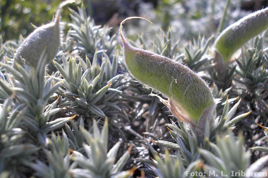 Cojín seríceo de 10-60 cm alt. y 30-60 cm diám. Tallos subdicotómicos, muy ramifi¬cados y hojosos hacia el ápice; entrenudos generalmente cortos, rara vez hasta 15 mm. Hojas 3-folioladas, estrigosas, pecíolos de 2-4 mm, folíolos de 5-10 (13) mm, verdoso-dorados o verdoso-plateados a veces en la misma rama, mucronados, ± divaricados o re-curvos; estípulas de 4-12 x 0,75-3 mm, lanceoladas, en la misma rama puede haber an¬chas y cortas con otras largas y angostas, connatas 1,5-2 (5) mm y unidas al pecíolo 1-2 (5) mm. Flores de 16-20 (23) mm, solitarias, apicales, rojas, anaranjadas, rosadas o ama¬rillas, pedúnculos de 3-9 mm. Cáliz pubescente, labio superior bilobulado, el inferior 3-dentado, dientes de 2 (3) mm, sin mucrones, tubo de 2-5 mm. Vexilo de 6-9 (11) x 5-8 (11) mm, de la mitad de longitud de los demás pétalos, redondeado o flabelado, lampi¬ño o con pelos próximos al ápice o dispuestos a lo largo de la parte media del dorso, uña corta; alas de 10-14 (19) x 3-3,5 mm, lampiñas o ± pubescentes en el 1/3 superior, sin aurículas, uñas de 2-4 mm; quilla de 11-18 (20) x 2-4,5 mm, lampiña o ± pubescente en la parte inferior, uñas de 2-4,75 mm. Androceo de 9-18 mm. Gineceo de 11-18 mm; ova¬rio pubescente, 9-13-15-(17-)ovulado, estilo filiforme, estigma capitado. Legumbre de 25-40 x 4-8 mm, con 3-5-9 (1-12) semillas castañas.