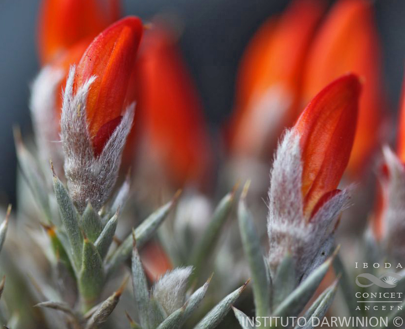 Cojín seríceo de 10-60 cm alt. y 30-60 cm diám. Tallos subdicotómicos, muy ramifi¬cados y hojosos hacia el ápice; entrenudos generalmente cortos, rara vez hasta 15 mm. Hojas 3-folioladas, estrigosas, pecíolos de 2-4 mm, folíolos de 5-10 (13) mm, verdoso-dorados o verdoso-plateados a veces en la misma rama, mucronados, ± divaricados o re-curvos; estípulas de 4-12 x 0,75-3 mm, lanceoladas, en la misma rama puede haber an¬chas y cortas con otras largas y angostas, connatas 1,5-2 (5) mm y unidas al pecíolo 1-2 (5) mm. Flores de 16-20 (23) mm, solitarias, apicales, rojas, anaranjadas, rosadas o ama¬rillas, pedúnculos de 3-9 mm. Cáliz pubescente, labio superior bilobulado, el inferior 3-dentado, dientes de 2 (3) mm, sin mucrones, tubo de 2-5 mm. Vexilo de 6-9 (11) x 5-8 (11) mm, de la mitad de longitud de los demás pétalos, redondeado o flabelado, lampi¬ño o con pelos próximos al ápice o dispuestos a lo largo de la parte media del dorso, uña corta; alas de 10-14 (19) x 3-3,5 mm, lampiñas o ± pubescentes en el 1/3 superior, sin aurículas, uñas de 2-4 mm; quilla de 11-18 (20) x 2-4,5 mm, lampiña o ± pubescente en la parte inferior, uñas de 2-4,75 mm. Androceo de 9-18 mm. Gineceo de 11-18 mm; ova¬rio pubescente, 9-13-15-(17-)ovulado, estilo filiforme, estigma capitado. Legumbre de 25-40 x 4-8 mm, con 3-5-9 (1-12) semillas castañas.
