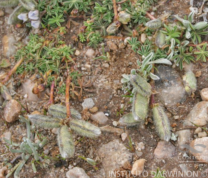 Hierba perenne, postrada o procumbentes, 1-5 cm alt. Tallos 1,5 mm diám. procumbentes, sub-glabros o pubescencia rala, entrenudos 0,5-1,5 cm long. Hojas 6-8-folioladas, dispuestas en fascículos a lo largo del tallo; estípulas subglabras 4,5-7 mm long., parte libre subulada 3 mm long. x 0,8 mm lat; pecíolo filiforme , 1,5-2,5 cm long.; folíolos angostamente obovados , semi-carnosos 6-7 mm long. x 2-2,5 mm lat., cara adaxial glabra o sólo con pocos pelos en los bordes, abaxial ralamente pilosa, ápice obtuso. Racimos compactos (1-) 2-4 (-5) cm long, con 1-3 verticilos., Flores 8-9 (-10) mm long.; brácteas caducas, angostamente ovadas , 3 mm long. x 1,2 mm lat., pubescente en el dorso; pedicelos 1-2 mm long.; bractéolas aciculares, 0,8 m long. x 0,2-0,4 mm lat., adheridas en el borde de la comisura de los labios del cáliz.. , Cáliz levemente seríceo exteriormente; labio inferior oblongo 4,5-5 mm long. x 2 mm lat., ápice obtuso, eroso; labio superior 3,7-4 mm long. , bífido, lóbulos 2-2,5 mm long. x 1-1,5 mm lat. ; Corola de color intermedio entre azulado y morado; estandarte oblongo, reflexo, glabro, 6-7 mm long. x 4-5 mm lat. ; alas 7-8 mm long. x 2,8-4 mm lat., uña 2 mm long.; quilla glabra, 2 mm lat. ; Ovario 3-4 ovulado; Legumbres finamente vellosas 1,2 cm long. x 0,45-0,55 cm lat.. Semillas 2,5 x 2 mm, color castaño claro con manchas oscuras.