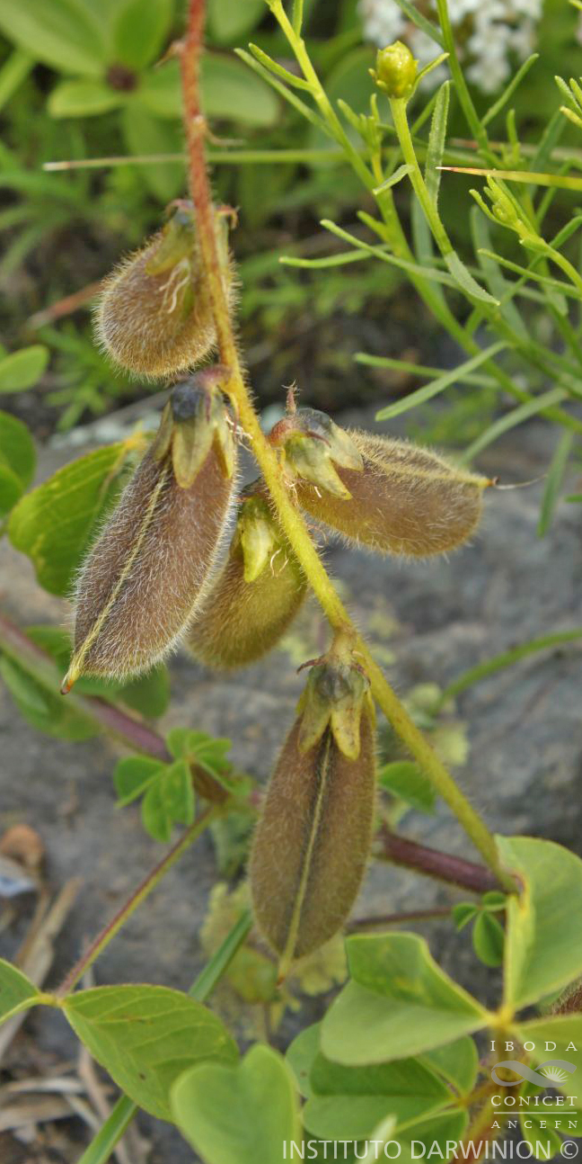 Arbusto o sufrutice 0,60-1,5 m alt., pubescente a glabrescente. Hojas trifolioladas, foliolos hasta 3 cm long x 2 cm lat., obovados a circulares, excepcionalmente elipticos, apice obtuso, apiculado, superficie adaxial glabra a espaciadamente pilosa, tricomas 0,2-0,5 mm long., superfice abaxial pilosa a glabrescente; estipulas filiformes, caducas. Racimos generalmente laxos, bracteas y bracteolas caducas; flores de 1,1/1,5 cm long; caliz ca. 9 mm long., 5 lobulos triangular subulados; estandarte subcircular, subigual a las alas y menor que la quilla, con 2 apendices oblicuamente elipticos, de borde liso, entre la lamina y la uña pubescente; alas rectangulares con uña oblicua, quilla ca. 1,3 cm long x 0,6 cm lat, triangular, cortamente rostrada, apice recto, borde superior y zona subsiguiente conspicuamente vellosa; estilo geniculado, de apice recto y cortamente pubescnete. Legumbre claviforme, cortamente apiculada, 2-3 cm long. x 0,5-0,6 cm lat, pubescente, castaño claro a oscura. Semillas oblicuo-cordiformes, comprimidas, ca. 2,5 mm diam., hilo semioculto por el lobulo radicular.