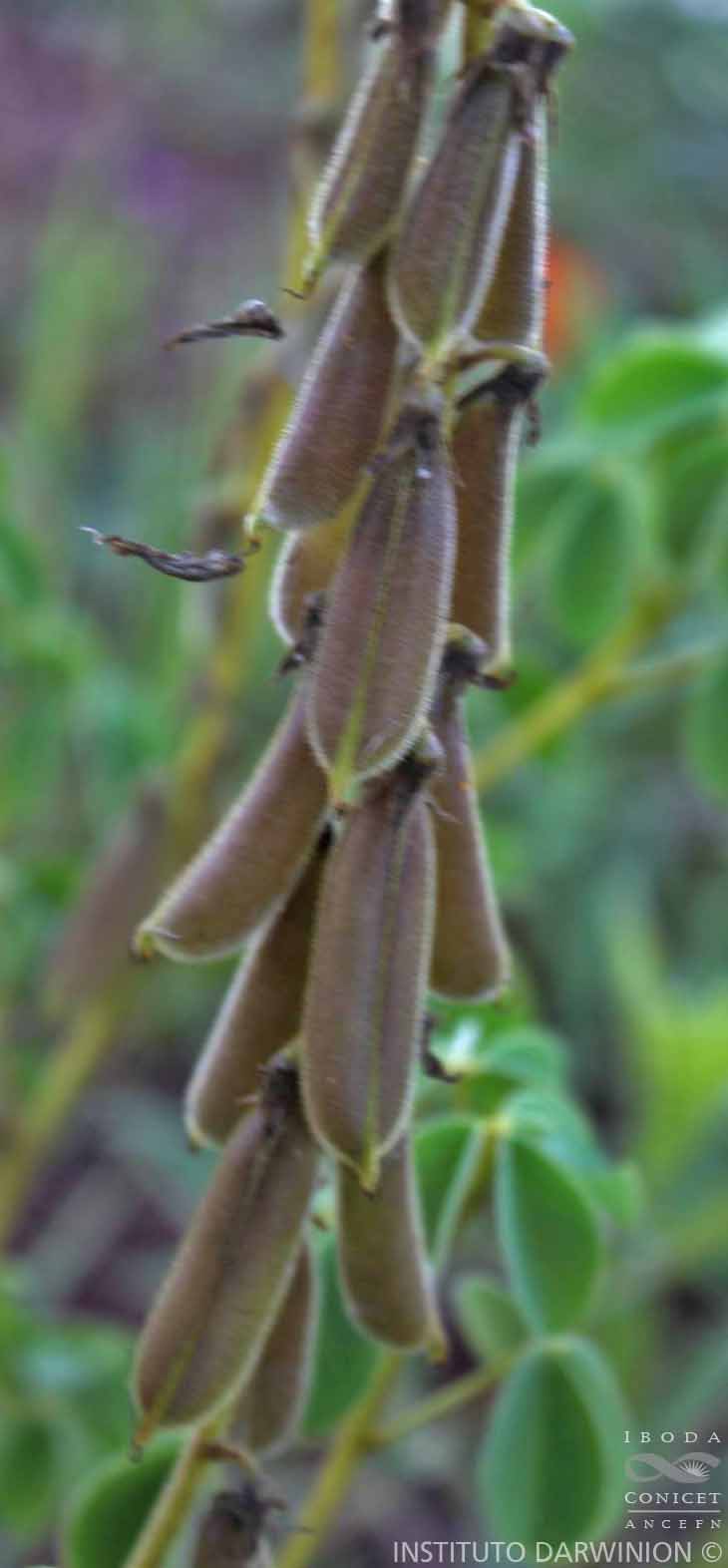 Arbusto o sufrutice 0,60-1,5 m alt., pubescente a glabrescente. Hojas trifolioladas, foliolos hasta 3 cm long x 2 cm lat., obovados a circulares, excepcionalmente elipticos, apice obtuso, apiculado, superficie adaxial glabra a espaciadamente pilosa, tricomas 0,2-0,5 mm long., superfice abaxial pilosa a glabrescente; estipulas filiformes, caducas. Racimos generalmente laxos, bracteas y bracteolas caducas; flores de 1,1/1,5 cm long; caliz ca. 9 mm long., 5 lobulos triangular subulados; estandarte subcircular, subigual a las alas y menor que la quilla, con 2 apendices oblicuamente elipticos, de borde liso, entre la lamina y la uña pubescente; alas rectangulares con uña oblicua, quilla ca. 1,3 cm long x 0,6 cm lat, triangular, cortamente rostrada, apice recto, borde superior y zona subsiguiente conspicuamente vellosa; estilo geniculado, de apice recto y cortamente pubescnete. Legumbre claviforme, cortamente apiculada, 2-3 cm long. x 0,5-0,6 cm lat, pubescente, castaño claro a oscura. Semillas oblicuo-cordiformes, comprimidas, ca. 2,5 mm diam., hilo semioculto por el lobulo radicular.