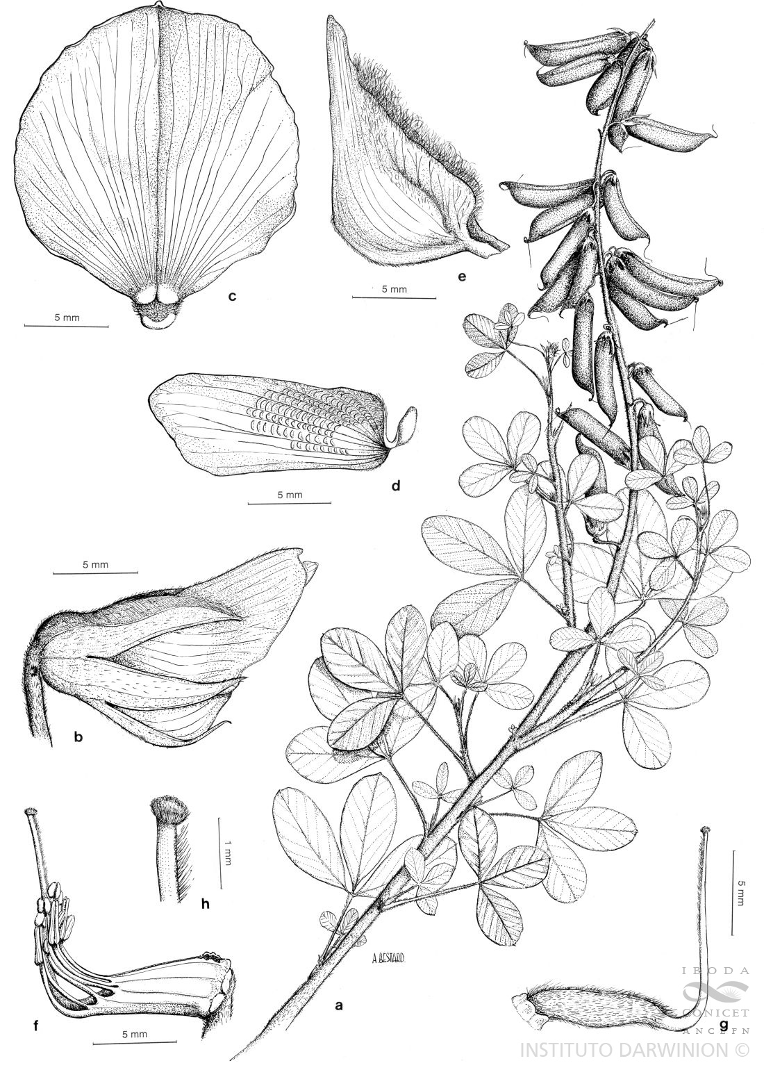 A. Rama fructífera. B. Flor. C. Estandarte. D. Ala. E. Quilla. F. Androceo y gineceo. H. Superficie estigmática