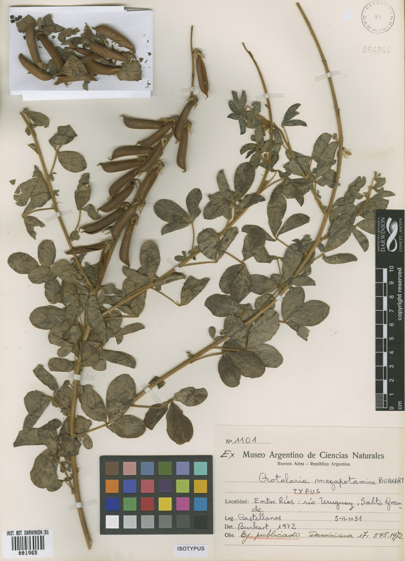 Material Tipo: Tab. 179, fig. 1, “Crotalaria trifolia fruticosa foliis rotundis incanis floribus spicatis è viridisluteis fructu pubescente” in Sloane, Voyage to Jamaica, 2. 1725, lectotipo designado por Polhill, 1997)