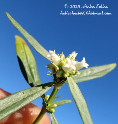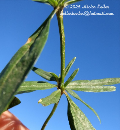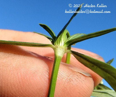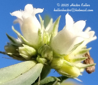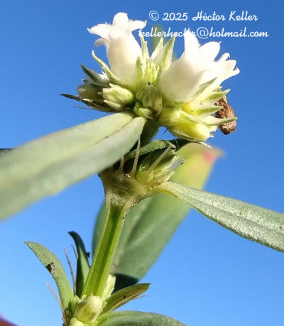 Sufrútice de 10-30 cm de alto; tallos 4-gonos, glabros. Hojas lineares o angostamente elípticas, de 13-23 × 1,5-5 mm, de base aguda, bordes revolutos, nervios secundarios inconspicuos, glabras, sésiles o pseudopecioladas; vaina estipular de 1-4 mm de largo, glabra o pubérula, con 6-7 fimbrias de 1-4 mm de largo. Inflorescencias con ramas floríferas distales dicotómicas, y glomérulos axilares, más o menos iguales entre sí, numerosos; brácteas 2 a 5 veces más largas que los glomérulos. Flores con hipanto de 1-2 mm de largo; cáliz con 4 lóbulos de 0,9-1,8 mm de largo, papilosos, el margen hírtulo, coléteres intercalares; corola actinomorfa, urceolada, de 1,1-2,7 mm de largo, blanca, externamente glabra o papilosa, internamente con una franja de pelos en la mitad inferior de los lóbulos, tubo corolino con pelos que siguen la vena media del lóbulo formando un segundo anillo de pelos laxos; estambres subsésiles, insertos en la mitad superior del tubo corolino, anteras de 0,25-0,9 mm de largo; estilo de 0,2-0,5 mm de largo, sobrepasando al disco, estigma 2-lobado; disco nectarífero entero, papiloso. Fruto una cápsula subglobosa, de 1,2-3,1 mm de largo, de dehiscencia septicida, valvas dehiscentes, pubérulas. Semillas subelipsoides, de 1-1,5 mm de largo, cara ventral plana con surco longitudinal cubierto por el estrofíolo, exotesta retículo-foveada.