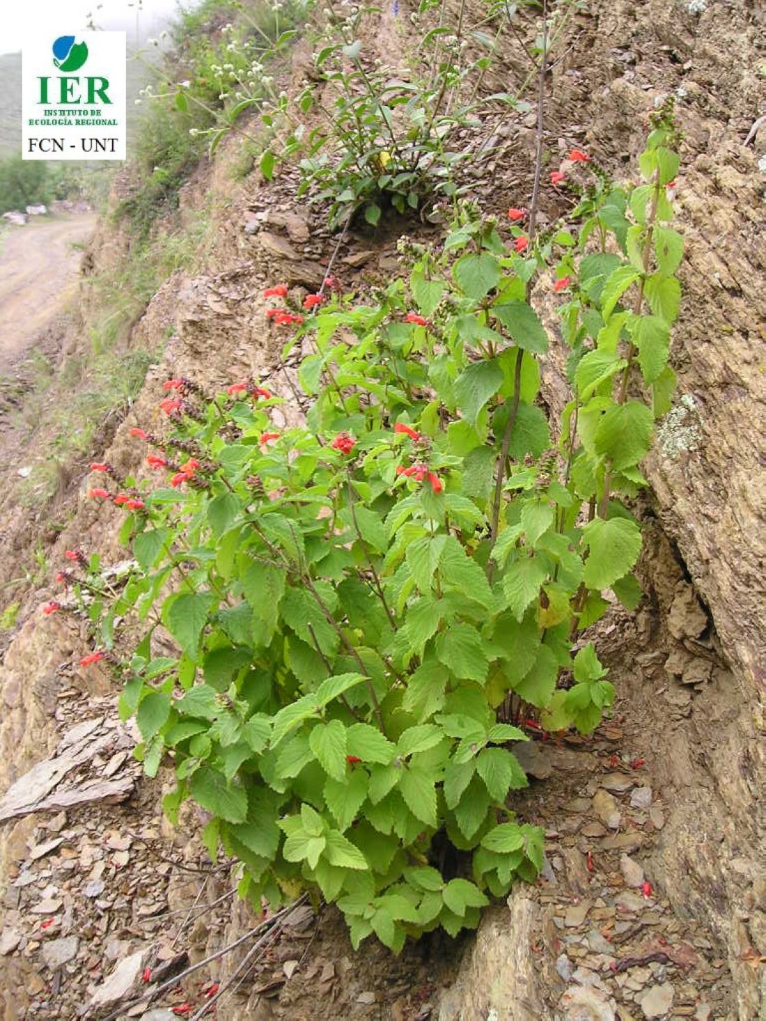 Hierbas perennes, de 80-150 cm de alto; tallos pubescentes. Hojas con pecíolo breve, de 0,5-0,8 cm de largo; láminas ovadas, de 1-8 × 0,5-5 cm, ápice agudo y base redondeada, margen regularmente serrado-dentado, ambas caras densamente pubescentes. Flores dispuestas en pseudoracimos bracteosos, densos, de 5-10 cm de largo; pedicelos breves, de 0,5-1 mm de largo; bractéolas subuladas, breves, solitarias u opuestas. Brácteas ovadas, ciliadas en el margen, de 2,5-12 × 1,5-8 mm. Cáliz acrescente, de 4-5 mm de largo, y hasta de 12 mm en la fructificación, piloso. Corola roja o anaranjada, de 12-16 mm de largo, muy pubescente, con pelos septados, tubo de 8-10 mm de largo, labio superior emarginado, el inferior 3-lobado con lóbulo central soldado al labio superior. Estambres pilosos en la base y hasta la mitad. Ginóforo con 3 apéndices, dos iguales entre sí y el tercero de mayor tamaño. Clusas globosas, marrón oscuros, aladas.