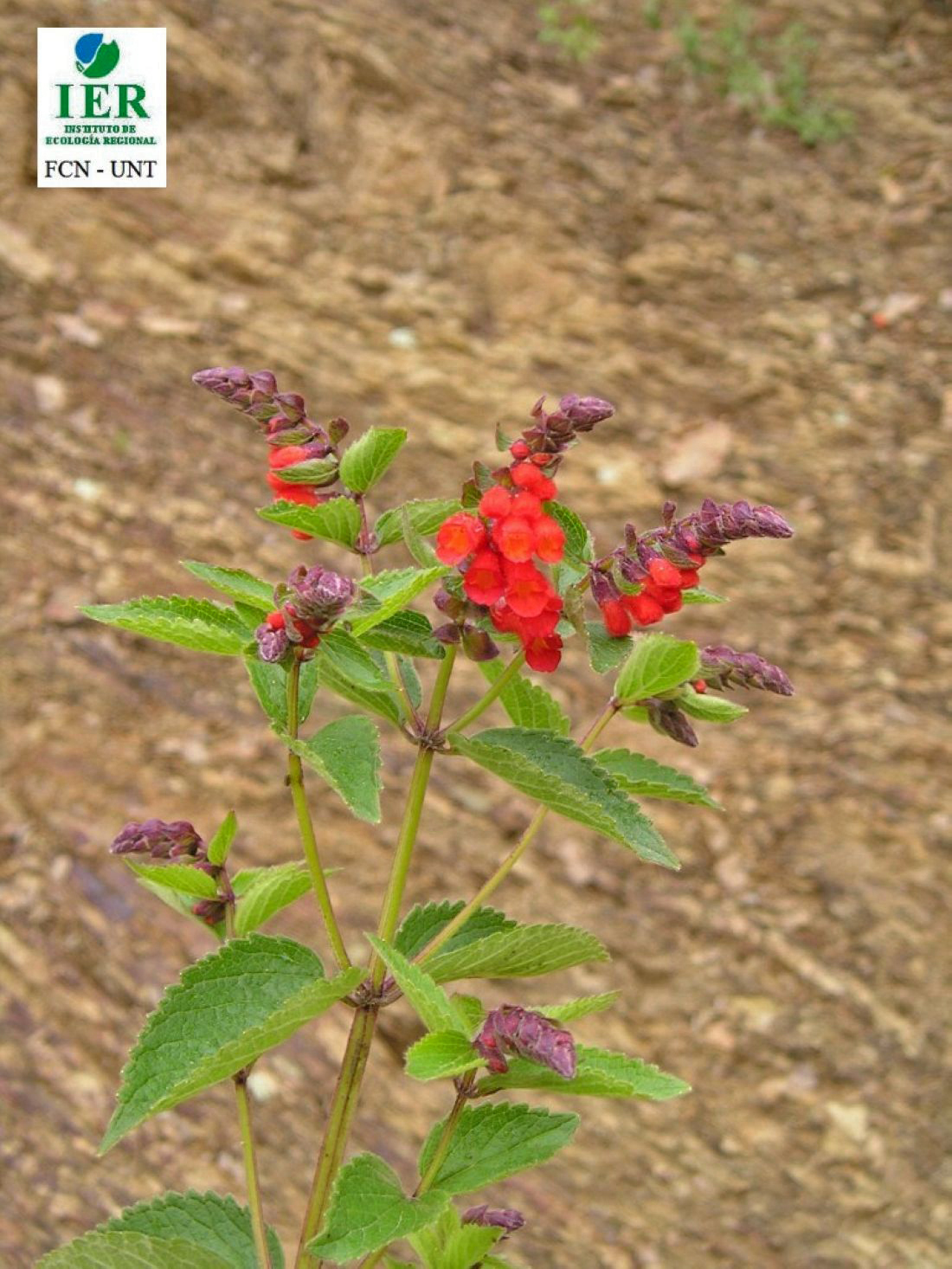 Hierbas perennes, de 80-150 cm de alto; tallos pubescentes. Hojas con pecíolo breve, de 0,5-0,8 cm de largo; láminas ovadas, de 1-8 × 0,5-5 cm, ápice agudo y base redondeada, margen regularmente serrado-dentado, ambas caras densamente pubescentes. Flores dispuestas en pseudoracimos bracteosos, densos, de 5-10 cm de largo; pedicelos breves, de 0,5-1 mm de largo; bractéolas subuladas, breves, solitarias u opuestas. Brácteas ovadas, ciliadas en el margen, de 2,5-12 × 1,5-8 mm. Cáliz acrescente, de 4-5 mm de largo, y hasta de 12 mm en la fructificación, piloso. Corola roja o anaranjada, de 12-16 mm de largo, muy pubescente, con pelos septados, tubo de 8-10 mm de largo, labio superior emarginado, el inferior 3-lobado con lóbulo central soldado al labio superior. Estambres pilosos en la base y hasta la mitad. Ginóforo con 3 apéndices, dos iguales entre sí y el tercero de mayor tamaño. Clusas globosas, marrón oscuros, aladas.