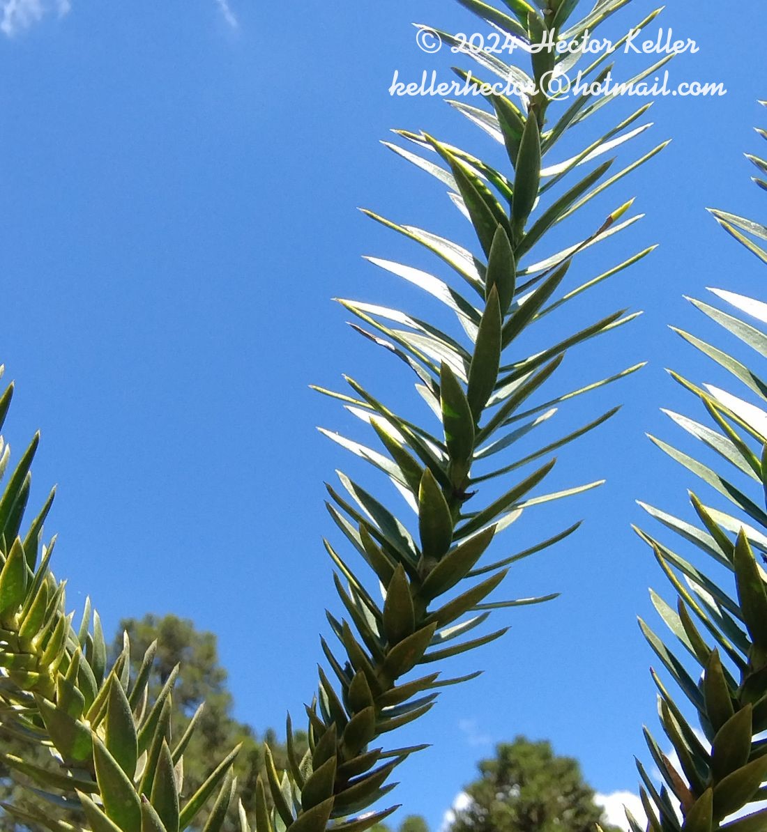 Árboles dioicos, hasta de 25-40(-50) m de alto, con troncos rectos, hasta de 1,50 m de diámetro y corteza gruesa y fisurada, que se exfolia en pequeñas placas, grisácea exteriormente, rojiza interiormente; exudado resinoso rojizo. Cuando joven el porte de las plantas es piramidal, luego adquiere forma aparasolada por la caída de las ramas basales. Ramas primarias 5-8-verticiladas, hasta de 5 m de largo, horizontales o ligeramente descendentes pero irguiéndose en las extremidades; ramas de segundo orden alternas o subverticiladas. Hojas laxamente imbricadas, excepto en la base de los conos, donde son más densas; láminas linear-lanceoladas, levemente asimétricas, de 2-4,5(-6) cm × 5-10 mm, nervio medio visible, verdes o glaucas. Conos masculinos solitarios o en grupos pequeños, en el extremo de un corto rámulo axilar, subcilíndricos, de 8-20 × 1,2-3 cm, erectos, volviéndose algo péndulos en la antesis; microsporofilos connados, de contorno cuneado a rómbico, de 4-5 × ca. 3 mm, ápice curvado, margen entero; sacos polínicos 8-12, lineares, de 3-8 mm de largo, colgantes, dispuestos en 2 filas. Conos femeninos a menudo agrupados de a 3-5, erectos, ovoides cuando inmaduros, globosos cuando maduros, de 12-20 cm de diámetro; macrosporofilos 100-300, ovoideo-oblongos, ca. 5 × 2 cm, castaños, con apéndice distal recurvado, hasta de 8 mm de largo, siendo por lo común estériles los macrosporofilos basales y apicales, los fértiles están adheridos a los óvulos. Semillas ovoideooblongas, ca. 3,5 × 1,5 cm, castaño-rojizas cuando maduras.