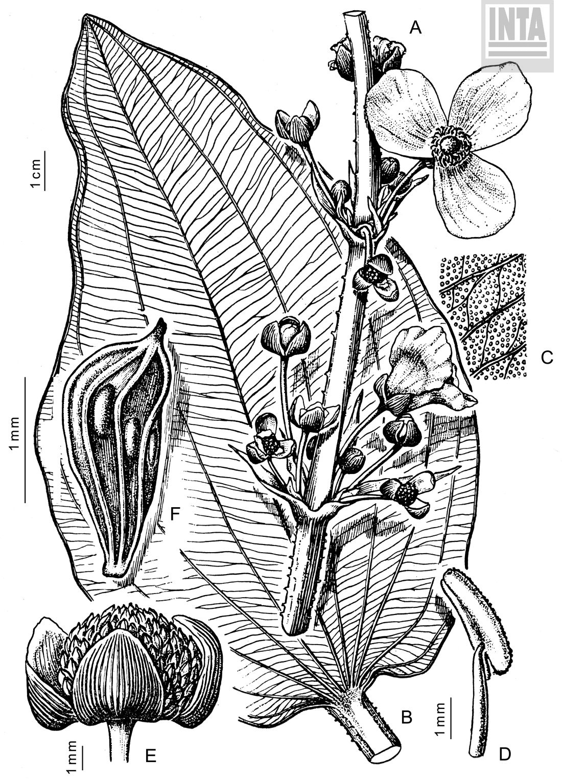 Planta perenne, con escapos erectos, superando las hojas, basalmente sub-cilíndricos, trígonos entre los verticilos florales, estriados. Hojas emergentes pecíolos teretes, 40-100 cm, base envainadora; lámina de 15-50 × 5,5-30 cm, ovales o anchamente elípticas, ápice agudo o redondeado, base cordada, con grandes puntos pelúcidos como gotas netamente visibles al trasluz, (7-) 9-15-nervadas, nervios curvilíneos, marcadamente prominentes en el envés, nervios secundarios paralelos, densos. Escapos, pecíolos, base de las hojas en el envés y pedicelos con o sin pelos ramosos. Inflorescencia paniculada generalmente hasta de 1m de largo, ramificada. Flores en 5-13 verticilos distantes, multifloros. Brácteas lanceoladas, largamente acuminadas, de margen escarioso, libres, menores que los pedicelos, estos desiguales, de 1,5-6 cm de largo. Flores de 3,5-5 cm de diám. Sépalos ovales, cóncavos, obtusos, plurinervios. Pétalos 2-3 veces mayores que los sépalos, tenues. Estambres numerosos, más de 20, anteras oblongas, subbasifijas, versátiles. Estilo simple. Carpelos numerosos, comprimidos, de contorno oboval. Aquenios de 2,8-3 × 1,4-1,6 mm, obovoides, comprimidos lateralmente, rostrados, atenuados en la base, dorso carenado, 2-3-costados, con 3-5 glándulas, resinosas cuyas secreciones mantienen unidos a los frutos. Semillas subredondeadas en cada cara punteada, pardo-rojizas.