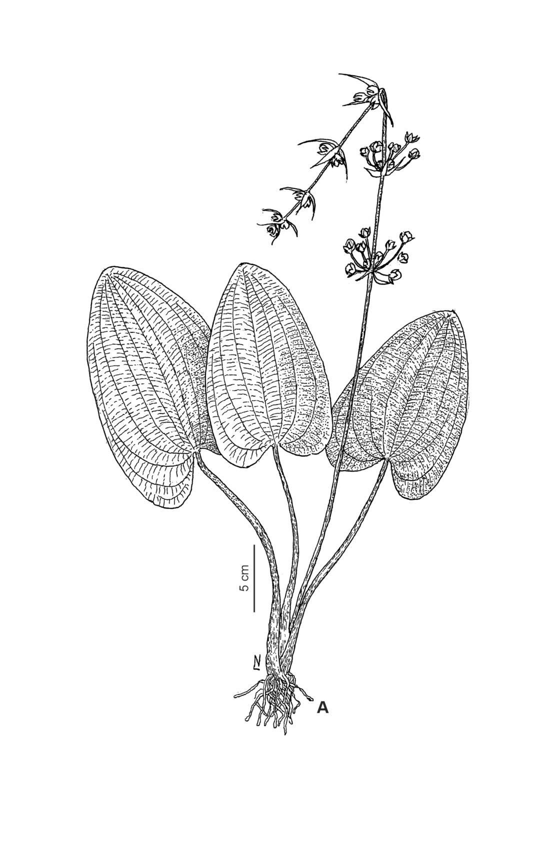 Planta perenne, con escapos erectos, superando las hojas, basalmente sub-cilíndricos, trígonos entre los verticilos florales, estriados. Hojas emergentes pecíolos teretes, 40-100 cm, base envainadora; lámina de 15-50 × 5,5-30 cm, ovales o anchamente elípticas, ápice agudo o redondeado, base cordada, con grandes puntos pelúcidos como gotas netamente visibles al trasluz, (7-) 9-15-nervadas, nervios curvilíneos, marcadamente prominentes en el envés, nervios secundarios paralelos, densos. Escapos, pecíolos, base de las hojas en el envés y pedicelos con o sin pelos ramosos. Inflorescencia paniculada generalmente hasta de 1m de largo, ramificada. Flores en 5-13 verticilos distantes, multifloros. Brácteas lanceoladas, largamente acuminadas, de margen escarioso, libres, menores que los pedicelos, estos desiguales, de 1,5-6 cm de largo. Flores de 3,5-5 cm de diám. Sépalos ovales, cóncavos, obtusos, plurinervios. Pétalos 2-3 veces mayores que los sépalos, tenues. Estambres numerosos, más de 20, anteras oblongas, subbasifijas, versátiles. Estilo simple. Carpelos numerosos, comprimidos, de contorno oboval. Aquenios de 2,8-3 × 1,4-1,6 mm, obovoides, comprimidos lateralmente, rostrados, atenuados en la base, dorso carenado, 2-3-costados, con 3-5 glándulas, resinosas cuyas secreciones mantienen unidos a los frutos. Semillas subredondeadas en cada cara punteada, pardo-rojizas.