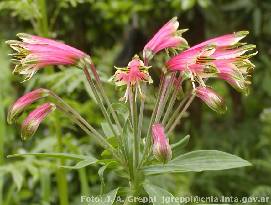 Tallos erectos, flexuosos, 50-100 cm de altura, con hojas agregadas a rosuladas hacia el extremo distal del tallo, resupinadas, lanceoladas, de ápice obtuso y atenuadas hacia la base, 4,2-8,5 x 0,5-1,7 cm. Inflorescencias generalmente con 5 pedicelos unifloros de 4-6 cm long., cada uno con una ramificación uniflora o bien sin ramificar; brácteas foliáceas, lanceoladas. Flores cernuas a levemente inclinadas, carmín o fucsia; tépalos acuminados, espatulados; los externos de color carmín oscuro o fucsia, verdosos hacia el ápice, poco variegados, 2,7-4,6 x 0,6-1,2 cm; el superior, ovado cuneado. Los internos, angostos, oblongos, purpúreos o fucsias, lineado-maculados de oscuro, de 3,0-4,4 x 0,2 0,8 cm, el inferior, de menor longitud. Estambres declinados, color rosa pálido. Cápsula con un umbón muy pequeño, de 0,5 cm long.