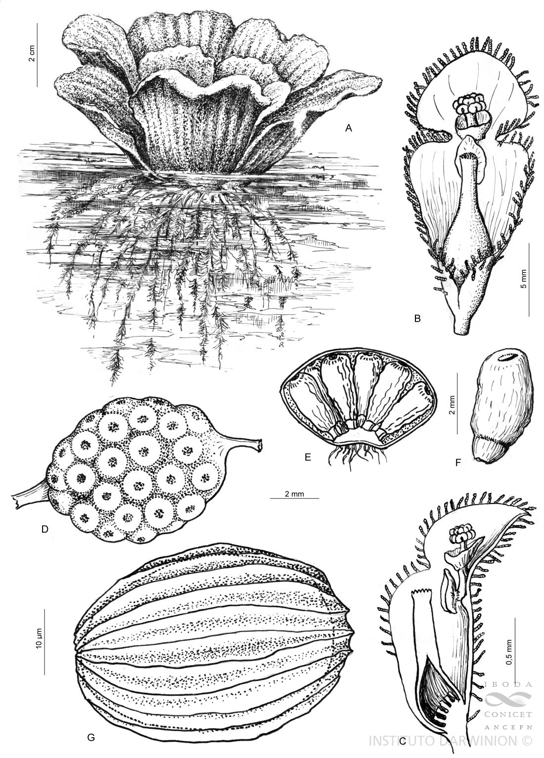 Hierbas acuáticas, estoloníferas, flotantes, sin látex. Hojas simples, crasas, acanaladas, obovado-espatuladas, sésiles; venación paralela. Espata blanca, angostada en su parte media delimitando dos zonas, la inferior con una flor pistilada sin estaminodios, la superior con 2-8 flores estaminadas. Flores imperfectas, desnudas. Estambres en sinandros. Ovarios con estilos breves. Bayas pluriseminadas. Roseta libremente flotante, raíces fasciculadas, simples, hasta de 40 cm de largo, con largos pelos absorbentes; estolones con internodios de 4-10 cm de largo, hojas de 3-12 × 2-6 cm, espatuladas, subsésiles o hasta con pecíolo de 4 cm de largo, herbáceas, verde claro, de consistencia esponjosa, papiloso-pubescentes, obtusas o emarginadas, con 5-9 nervios paralelos o un poco en abanico, muy marcado como costillas en el hipofilo, con parénquima aerífero. Inflorescencia pequeña, de 2 cm de largo, semiescondida entre las bases foliares, espata oval-lanceolada, en la base verde, muy pilosa, arriba blanca. Fruto ovoide, ca. 1 cm de largo, con muchas semillas, truncado-cilíndricas, rugosas, de 2-3 mm de largo.