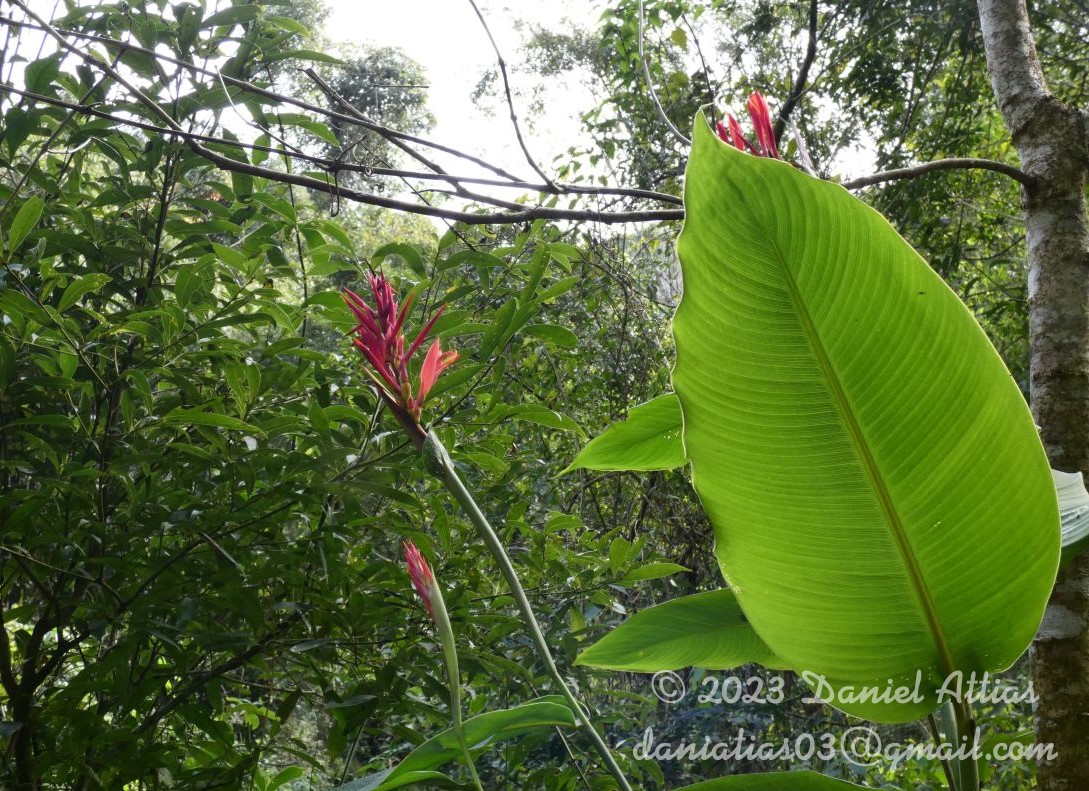 Hierba de 2-3 m alt., con rizomas gruesos de 30-40 mm diám. Tallos aéreos de 15-25 mm en la base. Láminas foliares ovales a elípticas, verdes, de hasta 50 cm long. por 20 cm lat., redondeadas en la base; vainas cerradas, de hasta 25 cm long. Inflorescencia racimosa simple, con hasta 6 nudos de los que se originan 1 ó 2 flores en cada uno. Sépalos color rojo a borravino, elípticos, de 10 mm long.; pétalos soldados formando un tubo basal corto, color rosado, de 50-60 mm long.; estaminodios externos 3, a veces con uno de ellos rudimentario, de 50-70 mm long., labelo bilobado a bífido, estambre fértil de 55-70 mm long.; ovario de 6-7 mm; estilo anaranjado a rosado o rojo, linear-aplanado, de 60 mm long. Cápsula ovoide o elipsoide, verrugoso-papilosa, de 25-45 mm long. Semillas negras o marrón obscuro, de 6-7 mm diám.