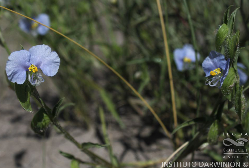 Hierba perenne, cespitosa, de raíces fasciculadas, gruesas. Tallos erguidos o decumbentes, no radicantes, pubérulos o glabros. Hojas de 4-15 × 0,3-4 cm, angostamente ovadas, agudas, o acuminadas, con fina pubescencia casi siempre más notoria en la cara adaxial, a veces casi glabras, borde escabriúsculo, algo ondeado. Vainas algo rojizas, ± pubérulas con 2 pequeñas aurículas, de borde ciliado, ausentes en las hojas apicales. Inflorescencias por lo común 1-3 en el ápice de los tallos, opositifolias; espata infundibuliforme, 1,3-2,3 cm de largo, con abundante mucílago en su interior, ± pubescente, pelos uncinados ± densos en toda su superficie y pelos largos, simples, casi siempre escasos, en su base; cima basal 0-flora, con pedúnculo atrofiado, cima apical 2-4-flora. Cáliz de sépalos internos unidos. Corola de 2 pétalos celestes transverso-ovados de 18-21 ×13-15 mm (sin contar la uña) y un tercer pétalo atrofiado, reducido a una pequeña escama blanquecina. Estambres fértiles opositisépalos, de filamentos celestes hacia el ápice, anteras con conectivo dilatado en dos gruesos apéndices en el dorso de la antera; estambres estériles de anteras amarillas, filamentos filiformes, amarillo pálido hacia el ápice. Ovario verdoso, con tricomas claviformes, trilocular, 3-ovulado. Estilo de ápice curvo, suavemente circinado, celeste hacia el ápice, estigma trilobado, celeste intenso. Cápsula 2-valvar, 3-seminada, valva dorsal caediza y valva ventral retro-refleja, persistente, indehiscente, rugosa, caduca. Semillas de los lóculos dehiscentes, ± elipsoidales, asimétricas, 3,2-4,8mm long., fértiles, farinosas, con reborde grueso, suberoso, cortado en su parte media a lo largo del margen próximo al embriotegio. fo. erecta.- Flores celestes o blancas.