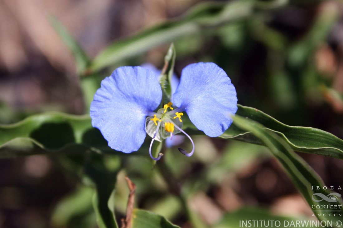 Hierba perenne, cespitosa, de raíces fasciculadas, gruesas. Tallos erguidos o decumbentes, no radicantes, pubérulos o glabros. Hojas de 4-15 × 0,3-4 cm, angostamente ovadas, agudas, o acuminadas, con fina pubescencia casi siempre más notoria en la cara adaxial, a veces casi glabras, borde escabriúsculo, algo ondeado. Vainas algo rojizas, ± pubérulas con 2 pequeñas aurículas, de borde ciliado, ausentes en las hojas apicales. Inflorescencias por lo común 1-3 en el ápice de los tallos, opositifolias; espata infundibuliforme, 1,3-2,3 cm de largo, con abundante mucílago en su interior, ± pubescente, pelos uncinados ± densos en toda su superficie y pelos largos, simples, casi siempre escasos, en su base; cima basal 0-flora, con pedúnculo atrofiado, cima apical 2-4-flora. Cáliz de sépalos internos unidos. Corola de 2 pétalos celestes transverso-ovados de 18-21 ×13-15 mm (sin contar la uña) y un tercer pétalo atrofiado, reducido a una pequeña escama blanquecina. Estambres fértiles opositisépalos, de filamentos celestes hacia el ápice, anteras con conectivo dilatado en dos gruesos apéndices en el dorso de la antera; estambres estériles de anteras amarillas, filamentos filiformes, amarillo pálido hacia el ápice. Ovario verdoso, con tricomas claviformes, trilocular, 3-ovulado. Estilo de ápice curvo, suavemente circinado, celeste hacia el ápice, estigma trilobado, celeste intenso. Cápsula 2-valvar, 3-seminada, valva dorsal caediza y valva ventral retro-refleja, persistente, indehiscente, rugosa, caduca. Semillas de los lóculos dehiscentes, ± elipsoidales, asimétricas, 3,2-4,8mm long., fértiles, farinosas, con reborde grueso, suberoso, cortado en su parte media a lo largo del margen próximo al embriotegio. fo. erecta.- Flores celestes o blancas.