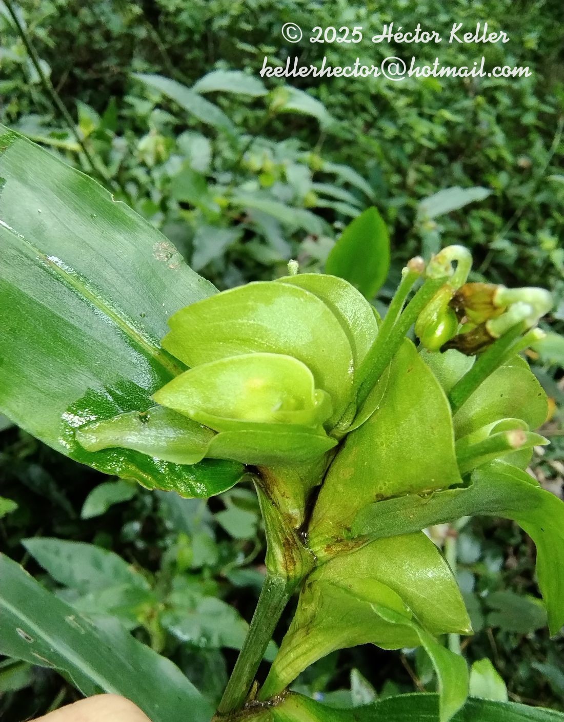 Hierba perenne, cespitosa, de raíces fasciculadas, gruesas. Tallos erguidos o decumbentes, no radicantes, pubérulos o glabros. Hojas de 4-15 × 0,3-4 cm, angostamente ovadas, agudas, o acuminadas, con fina pubescencia casi siempre más notoria en la cara adaxial, a veces casi glabras, borde escabriúsculo, algo ondeado. Vainas algo rojizas, ± pubérulas con 2 pequeñas aurículas, de borde ciliado, ausentes en las hojas apicales. Inflorescencias por lo común 1-3 en el ápice de los tallos, opositifolias; espata infundibuliforme, 1,3-2,3 cm de largo, con abundante mucílago en su interior, ± pubescente, pelos uncinados ± densos en toda su superficie y pelos largos, simples, casi siempre escasos, en su base; cima basal 0-flora, con pedúnculo atrofiado, cima apical 2-4-flora. Cáliz de sépalos internos unidos. Corola de 2 pétalos celestes transverso-ovados de 18-21 ×13-15 mm (sin contar la uña) y un tercer pétalo atrofiado, reducido a una pequeña escama blanquecina. Estambres fértiles opositisépalos, de filamentos celestes hacia el ápice, anteras con conectivo dilatado en dos gruesos apéndices en el dorso de la antera; estambres estériles de anteras amarillas, filamentos filiformes, amarillo pálido hacia el ápice. Ovario verdoso, con tricomas claviformes, trilocular, 3-ovulado. Estilo de ápice curvo, suavemente circinado, celeste hacia el ápice, estigma trilobado, celeste intenso. Cápsula 2-valvar, 3-seminada, valva dorsal caediza y valva ventral retro-refleja, persistente, indehiscente, rugosa, caduca. Semillas de los lóculos dehiscentes, ± elipsoidales, asimétricas, 3,2-4,8mm long., fértiles, farinosas, con reborde grueso, suberoso, cortado en su parte media a lo largo del margen próximo al embriotegio. fo. erecta.- Flores celestes o blancas.