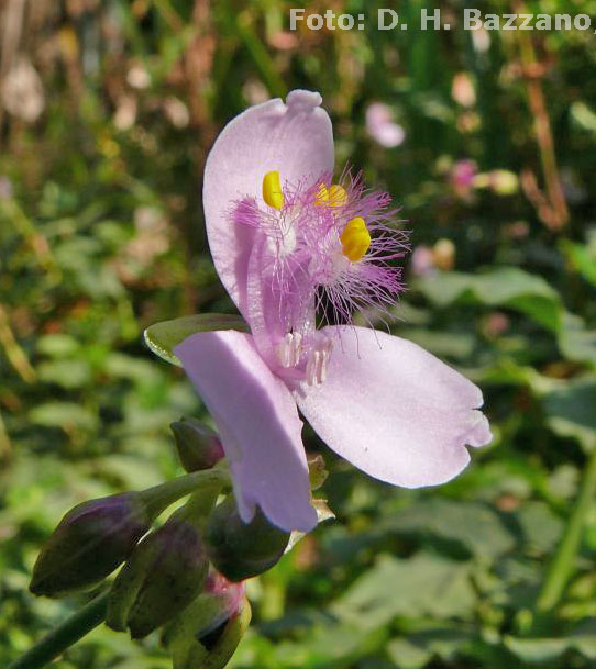 Hierba perenne, rastrera, de tallos floríferos erguidos, glabros, solo con línea longitudinal opositifolia de pelos uniseriados, a veces ausente, sobre todo en los nudos inferiores. Hojas sésiles, de 1-6(-9) × 1-2,2 cm, cordado aovadas o elípticas, semiamplexicaules, inequilaterales, apiculadas, carnosas, de bordes algo ondeados, glabras, solo con hilera muy regular, uniseriada, de pelos aculeados sobre el margen; vaina de borde ciliado con hilera longitudinal, opositifolia, de pelos uniseriados. Pedúnculos y pedicelos con pelos capitados; brácteas verdoso-hialinas, con pelos bicelulares sobre el borde y pelos capitados sobre el dorso a glabras. Sépalos de 4-5 mm de largo, ovados, naviculares, con pelos capitados sobre el dorso. Pétalos de 3,5-6 × 2-3 mm, de color blanco o rosado-pálido, elípticos u ovados. Estambres episépalos barbados con pelos moniliformes, de color violáceo intenso hacia el ápice, estambres epipétalos glabros, polen isomorfo, abundante, blanco, fértil, en ambos grupos estaminales. Ovario globoso-trígono, glabro; estilo la mitad más corto que el ovario o algo menor. Semilla subtetraédrica, 1mm de largo, costado-radiada con trabéculas transversales.