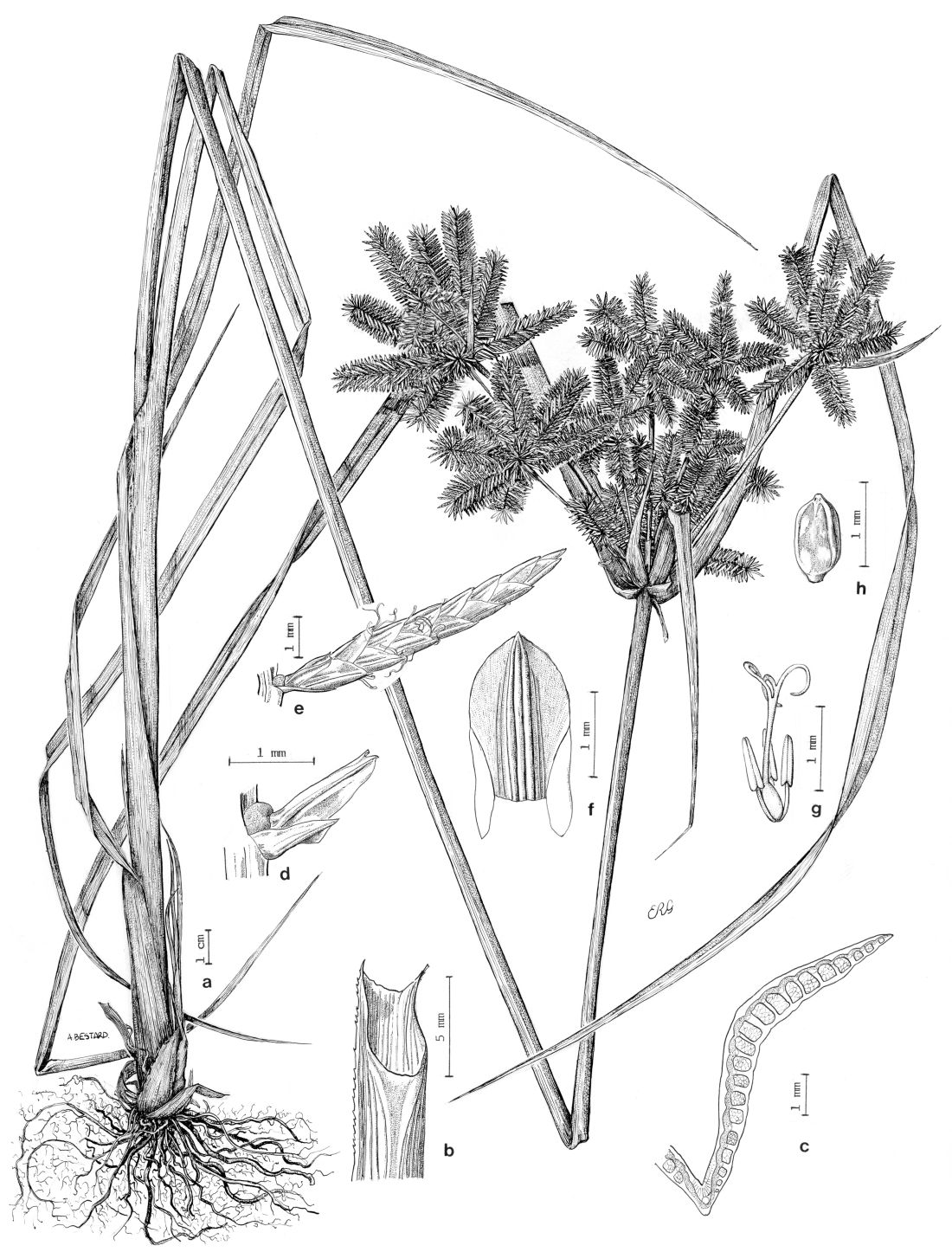 A. Planta. B. Ápice de un cladoprofilo de un eje primario. C. Transección de la mitad de la lámina foliar. D. Detalle de la inserción de una espiguilla, con bráctea glumiforme y profilo. E. Espiguilla. F. Gluma con alas decurrentes. G. Flor. H. Aquenio.