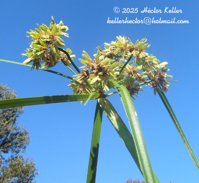 Rizoma cespitífero. Tallos triangulares, lisos, de ángulos obtusos, de 15-60 cm de alto. Hojas del largo del tallo, de 4-8 mm de ancho, ligeramente escabrosas en los bordes. Inflorescencia en antela más o menos desarrollada, a veces contraída; radios 7-9 en las formas robustas, en que pueden llegar a 10 cm; radios secundarios dispuestos en corimbo; umbelas secundarias contraídas a veces en glomérulos; espiguillas linear-lanceoladas de 11-15 x 2-2,5 mm con 18-30 flores. Estambre único. Estigmas 3. Aquenio obovoide, trígono, atenuado en la base en estípite corto de color purpúreo, así como el mucrón, de 1,1-1,4 mm.