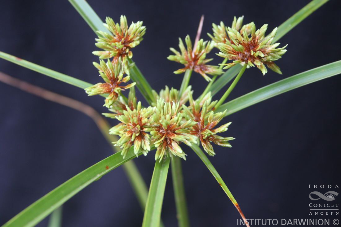 Rizoma cespitífero. Tallos triangulares, lisos, de ángulos obtusos, de 15-60 cm de alto. Hojas del largo del tallo, de 4-8 mm de ancho, ligeramente escabrosas en los bordes. Inflorescencia en antela más o menos desarrollada, a veces contraída; radios 7-9 en las formas robustas, en que pueden llegar a 10 cm; radios secundarios dispuestos en corimbo; umbelas secundarias contraídas a veces en glomérulos; espiguillas linear-lanceoladas de 11-15 x 2-2,5 mm con 18-30 flores. Estambre único. Estigmas 3. Aquenio obovoide, trígono, atenuado en la base en estípite corto de color purpúreo, así como el mucrón, de 1,1-1,4 mm.