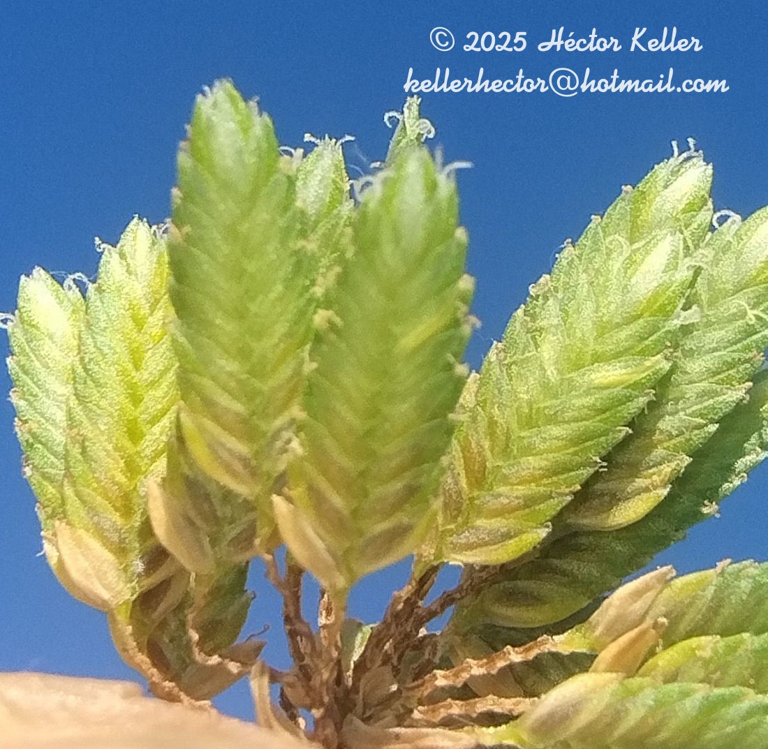 Rizoma cespitífero. Tallos triangulares, lisos, de ángulos obtusos, de 15-60 cm de alto. Hojas del largo del tallo, de 4-8 mm de ancho, ligeramente escabrosas en los bordes. Inflorescencia en antela más o menos desarrollada, a veces contraída; radios 7-9 en las formas robustas, en que pueden llegar a 10 cm; radios secundarios dispuestos en corimbo; umbelas secundarias contraídas a veces en glomérulos; espiguillas linear-lanceoladas de 11-15 x 2-2,5 mm con 18-30 flores. Estambre único. Estigmas 3. Aquenio obovoide, trígono, atenuado en la base en estípite corto de color purpúreo, así como el mucrón, de 1,1-1,4 mm.