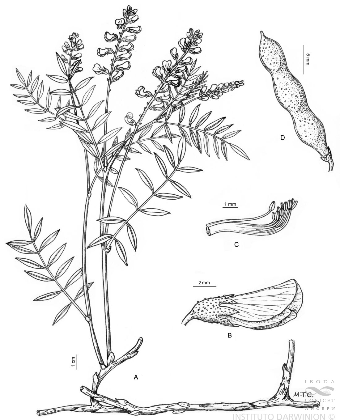 Sufrútice glabro, glanduloso. Raíz principal axonomorfa, leñosa; rizomas largos, pro¬fundos, cubiertos por catáfilas. Tallos hasta 50 cm o más, verdes a castaño-rojizos. Ho¬jas alternas, con 3-7 pares de folíolos opuestos; raquis con mechones de pelos carnosos en la inserción de los peciólulos; estípulas de 2,5-3,5 mm, ovadas a triangulares, frecuen¬temente ciliadas en el margen, caedizas; folíolos de 5-30 (3E>) x 2-10 (15) mm, el termi¬nal generalmente mayor, elípticos a obovados, emarginados o mucronados, 1-nervios u oscuramente pinnatinervios. Racimos de 2-15 cm, al principio compactos, luego laxos. Flores de 7-8 mm, azules o violáceas, brevemente pediceladas; bráctea de 2-4 mm, lan-ceolado-acuminada, hirsuta, caediza. Cáliz de 3,5-5 mm, glanduloso-pubescente; dientes triangulares, los superiores ± soldados, los inferiores hasta 3 mm. Vexilo de 6,5- 7,5 x 4-5 mm, anchamente elíptico, rara vez ovado, uña breve, cóncava; limbo de las alas de 4-5 x 1,5-2 mm, elíptico, obtuso, uña breve; limbo de la quilla hasta 4 mm, agudo, uña de 1,5-2 mm. Ovario de 2-4 x 0,6-1,2 mm, elipsoide, glanduloso, 3-4-ovulado; estilo de 2,5-3 mm, recto. Legumbre de 10-20 x 4-7 mm, 1-4 seminada, comprimida, a veces toru-losa, mucronada, glandulosa, castaña. Semillas de 4-5 x 2,5-3,5 mm, ovoides